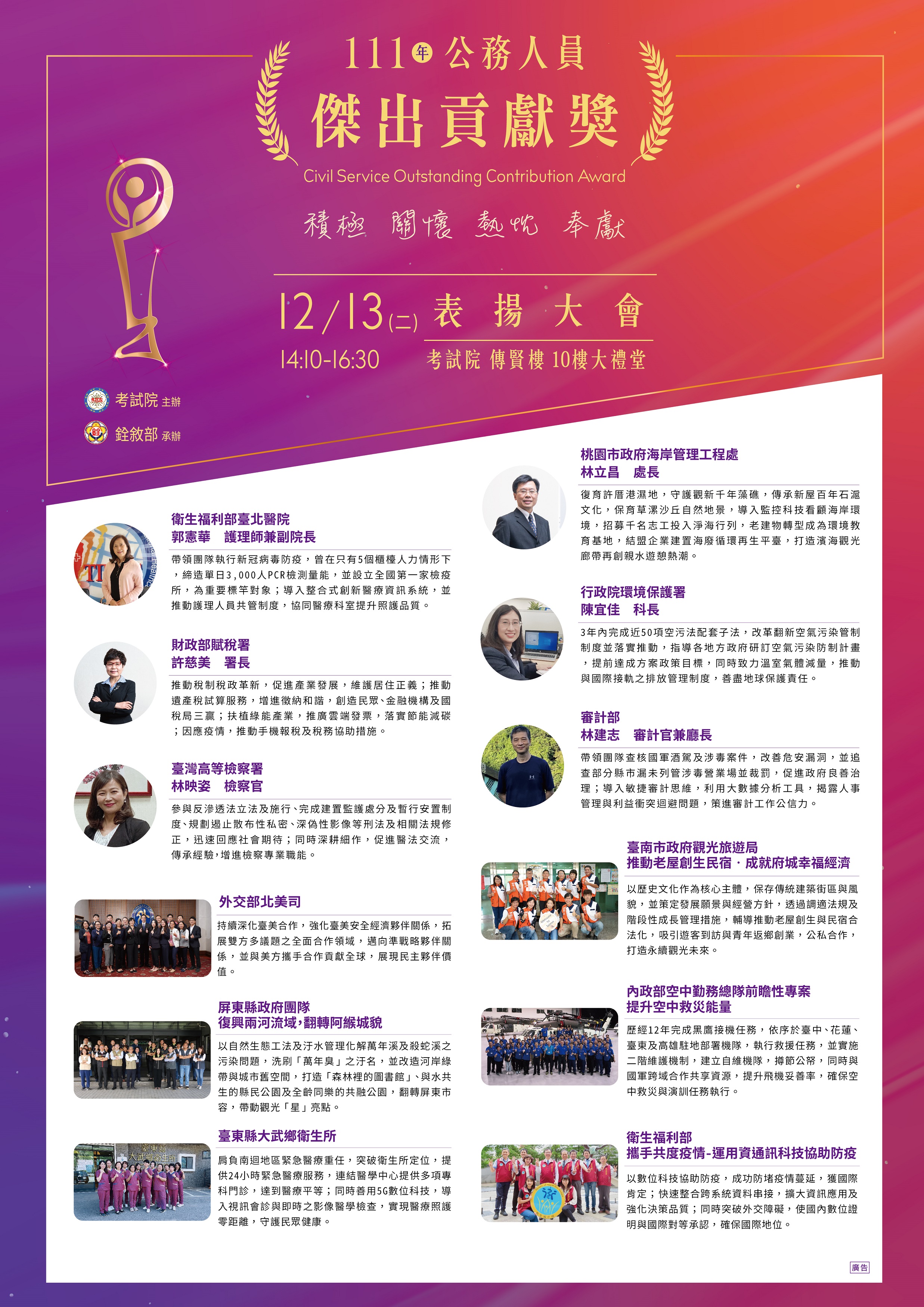 表揚111年公務人員傑出貢獻獎6名得獎人及6組得獎團體。