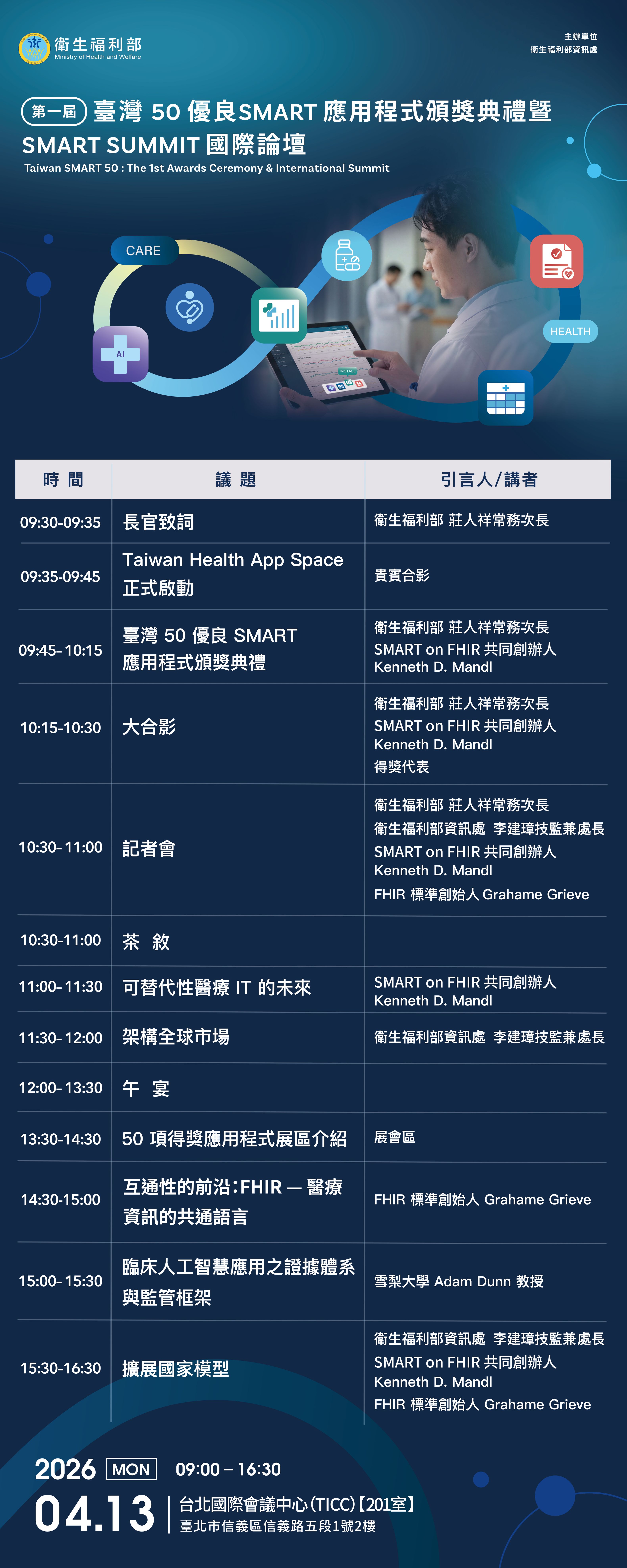 本次活動透過「臺灣50」優良SMART on FHIR應用程式徵案競賽,自115件作品中遴選出50件具代表性之創新應用。這些應用如同智慧醫療領域的「0050」,代表具高度發展潛力與示範價值的成果,未來可望於各級醫療院所廣泛應用,帶動整體醫療服務品質提升。