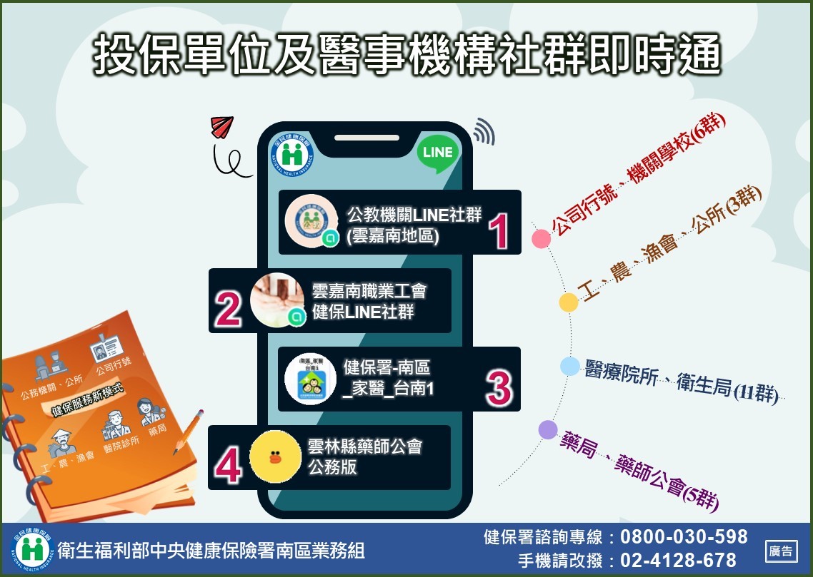 健保署南區業務組依據服務對象,分群專人經營社群,提供LINE社群的線上即時服務,加入該組專屬LINE社群,除可獲得健保最新資訊外,遇到各項健保疑難雜症,可於社群發問,即有專人迅速提供解答,且線上相互交流。