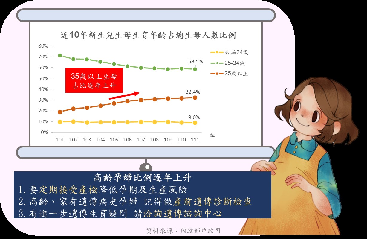依據內政部111年人口統計資料顯示,國內女性生育平均年齡為32.4歲,其中35歲以上者達3成以上(32%),是10年前(民國101年19%)的1.7倍!國人晚婚遲育現象日趨普遍,隨著女性生育年齡升高,準媽媽們孕程及生產風險也隨之增加。國民健康署呼籲年齡超過34歲孕媽咪除定期產檢外,為了自己以及寶寶的健康,也要依照產檢醫師的建議接受產前遺傳診斷檢查!目前全台共有14家經衛生福利部國民健康署審查通過的「遺傳諮詢中心」(北部4家、中部4家、南部5家及東部1家),提供民眾遺傳疾病的診斷、治療及諮詢服務。