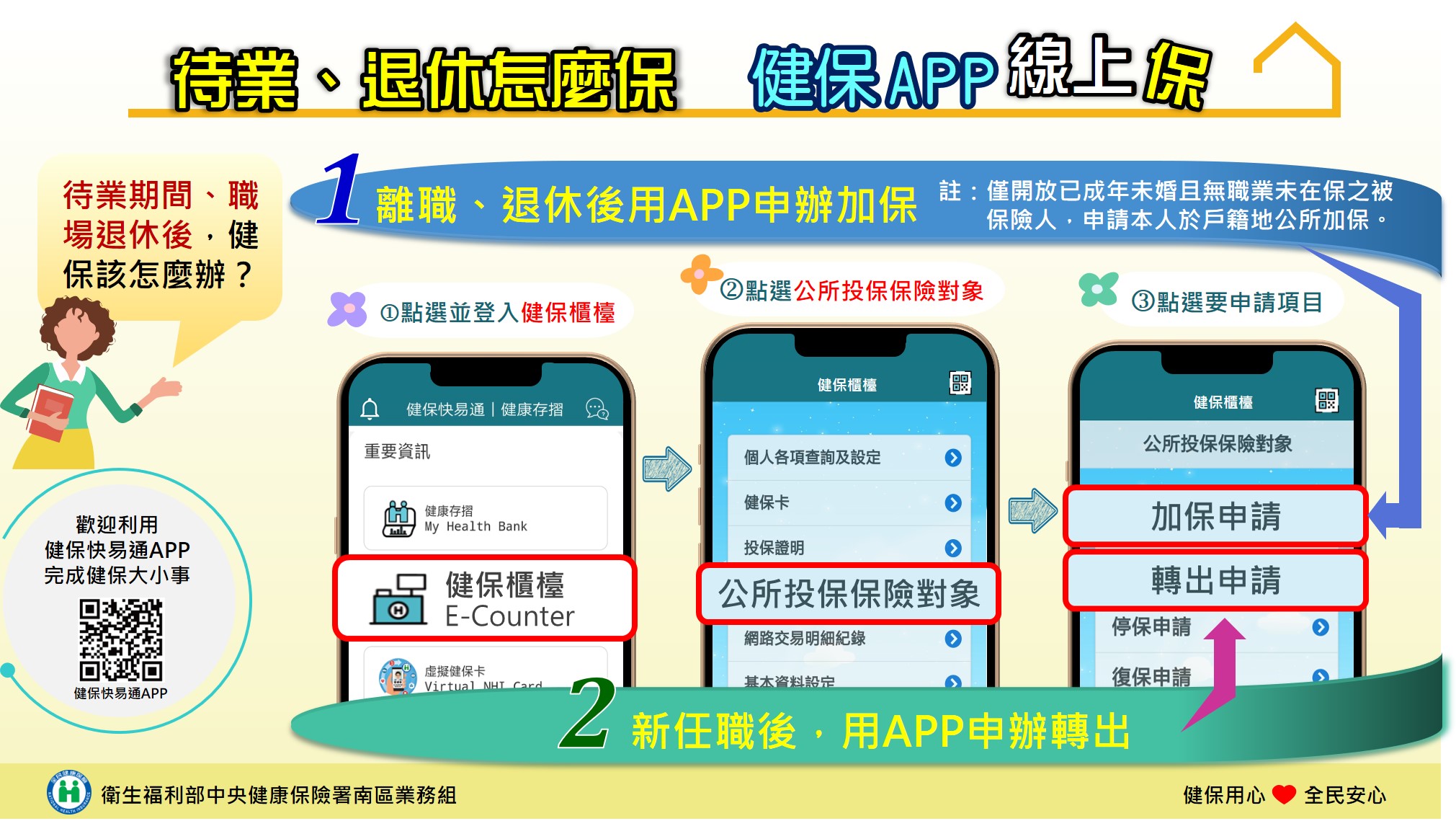 健保署南區業務組林純美組長表示,全民健保為強制性社會保險,符合投保資格者應依法參加全民健保,不能中斷投保。若成年民眾在待業期間或退休者,無適法對象可依附投保而屬於第六類被保險人,除可攜帶身分證、戶口名簿及印章至戶籍地公所或健保署各服務據點辦理投保手續外,建議可透過手機下載「健保快易通APP」,點選「健保櫃檯/公所投保保險對象/加保申請」,並參考相關說明後申請,免出門就能完成線上申辦第六類投保。若日後任新職時,也可利用APP線上申辦轉出手續。