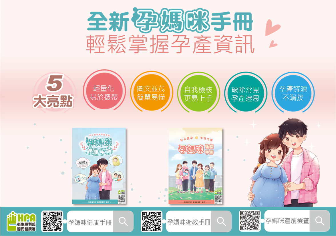 對於即將邁入新人生階段的孕媽咪來說,心情可能交雜著迎向未知變化的緊張和焦慮,正確的孕產知識與家人們的支持,是孕媽咪最佳的應援。國民健康署為提供準爸媽更容易閱讀及理解的孕產衛教資訊,從孕媽咪的視角出發,傾聽及同理孕媽咪們的問題與需求,諮詢各領域專家及參採孕產照護人員意見,並參考國際實證,經多次焦點座談及試讀意見蒐集,編製新版「孕媽咪健康手冊」及「孕媽咪衛教手冊」,以生活化的內容為主體,採用活潑生動及溫馨的設計風格,希望陪伴媽咪和家人一起經歷孕產過程,當感到疑惑時,可翻閱手冊尋找解答,並諮詢醫事人員。