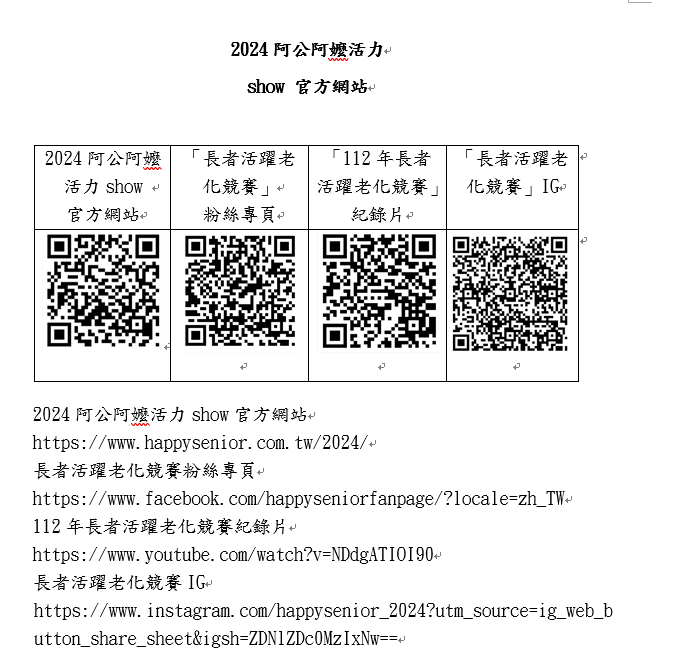 依據國家發展委員會推估,在明(114)年台灣老年人口將超過20%以上,成為「超高齡社會」,讓長者持續獲得身體活動及社會參與的機會成為重要的議題。國民健康署舉辦多年的「長者活躍老化競賽」提供一個專屬長者的舞台,展現健康活力與生命價值,同時給予長者圓夢的機會,實踐「健康老化」、「活躍老化」及「幸福老化」的核心價值。今年10月29日「阿公阿嬤活力SHOW」全國總決賽,國民健康署提供臉書粉絲團直播服務,讓無法到場的民眾和親友們,一同為長輩們加油。詳細活動訊息,民眾可至官方網站,或「長者活躍老化競賽」臉書粉絲專頁查詢。