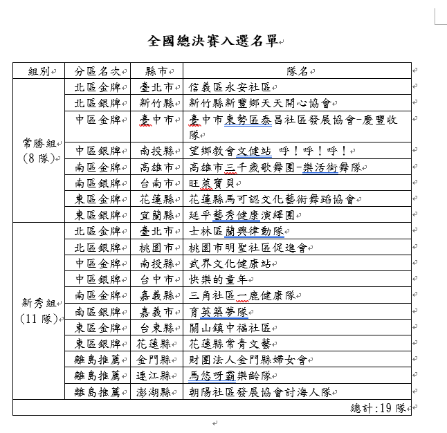 今年454支社區隊伍從6-9月間參加縣市初賽篩選,8-9月間北、中、南、東四場分區競賽,從分區競賽中脫穎而出獲得金獎、銀獎的隊伍計16隊及離島縣市3隊,分別來自:台北市、桃園市、新竹縣、台中市、南投縣、嘉義市、嘉義縣、台南市、高雄市、宜蘭縣、花蓮縣、台東縣、連江縣、澎湖縣及金門縣等15縣市,這群充滿活力與熱情的不老寶貝,將在10月29日的全國總決賽,帶來精采的演出,展現不輸年輕人的元氣,長輩們融入創意透過表演展現不服輸的樂齡生活價值與生命韌性。