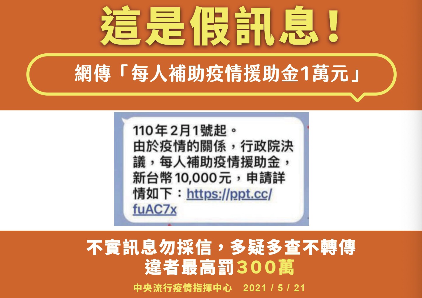 (疾管署) 網傳「每人補助疫情援助金1萬元」為假訊息 指揮中心:轉傳假訊息將依法開罰