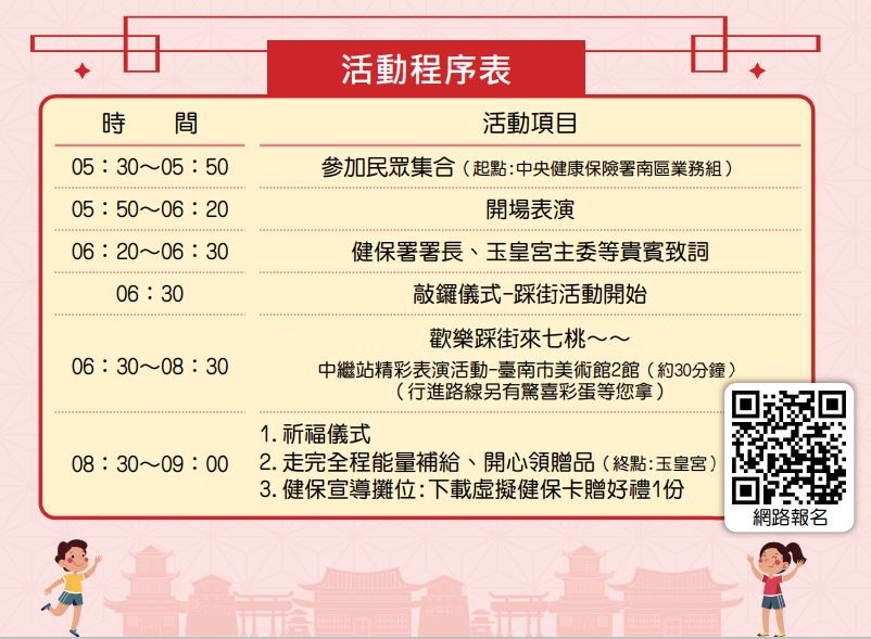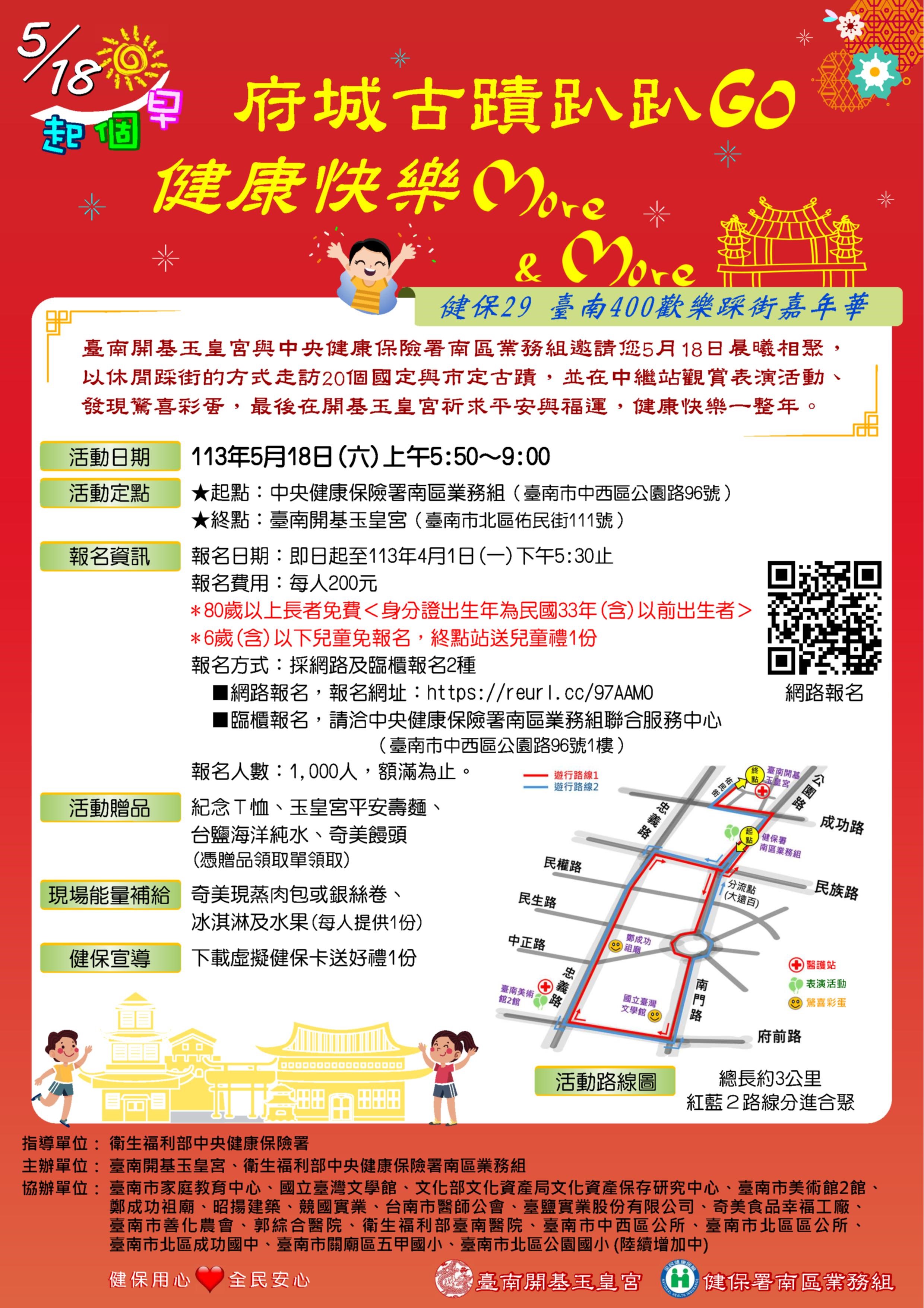 為歡慶健保29週年,並欣逢臺南建城400年,中央健康保險署(以下簡稱健保署)南區業務組與臺南開基玉皇宮於5月18日(星期六)共同舉辦 「府城古蹟趴趴go 健康快樂more & more 」早起活動,熱情邀請民眾攜眷,號召親朋好友,一起響應「愛健康、挺健保」向前行,休閒踩街走訪府城古蹟,親自體驗台南文化古都之美。