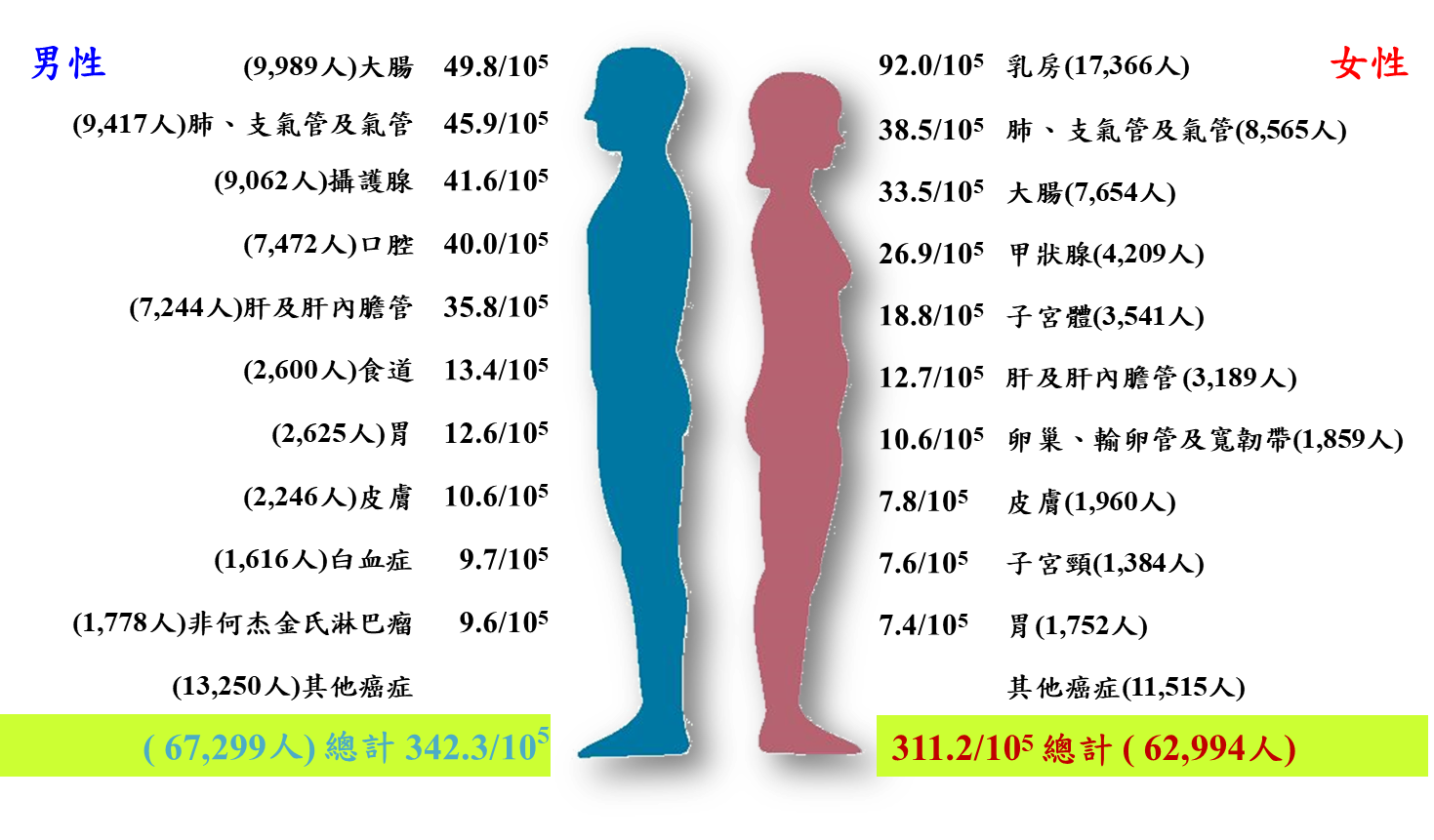 依據最新衛生福利部111年癌症登記報告,新發生癌症人數為13萬293人,較110年增加8,531人,全癌症標準化發生率為每10萬人口323.3人,較110年增加16.8人。111年全癌症發生年齡中位數為64歲,與110年相同,各主要癌症發生年齡中位數,除了肺癌、皮膚癌及子宮體癌提早1歲,其餘與110年相同。部分癌症發生年齡中位數較全癌症年齡中位數(64歲)早的癌別,口腔癌為59歲、子宮體癌為56歲、乳癌為57歲、甲狀腺癌為50歲。十大癌症新發生人數(男女合計)依序為(1)肺癌(2)大腸癌(3)女性乳癌(4)肝癌(5)攝護腺癌(6)口腔癌(含口咽、下咽)(7)甲狀腺癌(8)胃癌(9)皮膚癌(10)子宮體癌,與110年相比,除了(5)攝護腺癌(6)口腔癌(含口咽、下咽)序位互換、(10)子宮體癌與(11)胰臟癌序位互換(110年胰臟癌第10名),其餘排序與110年相同(如附表)。