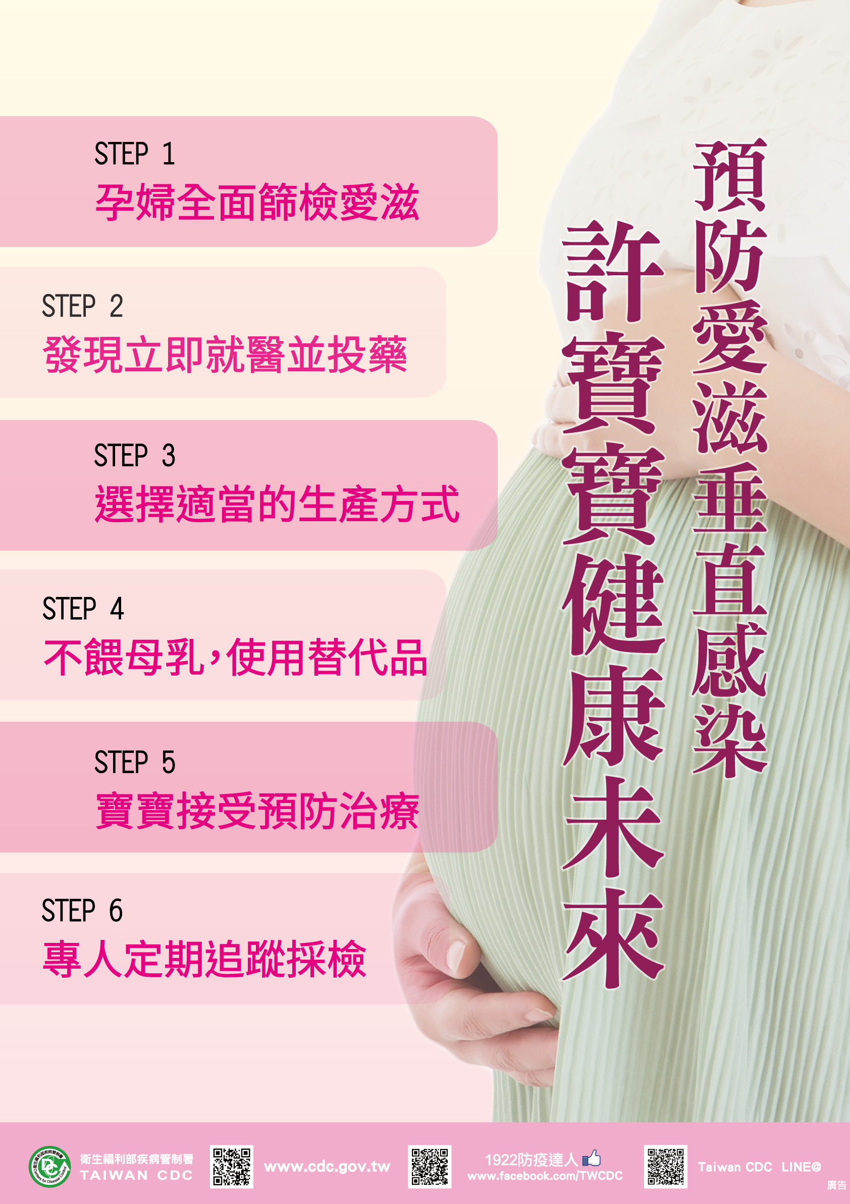 婦女懷孕期接受愛滋篩檢為預防母子垂直感染的關鍵期,為了讓嬰幼兒免於愛滋威脅,疾管署自94年起推動「孕婦全面篩檢愛滋計畫」,並就篩檢、醫療及照護三方面,架構母子垂直感染防疫網:
