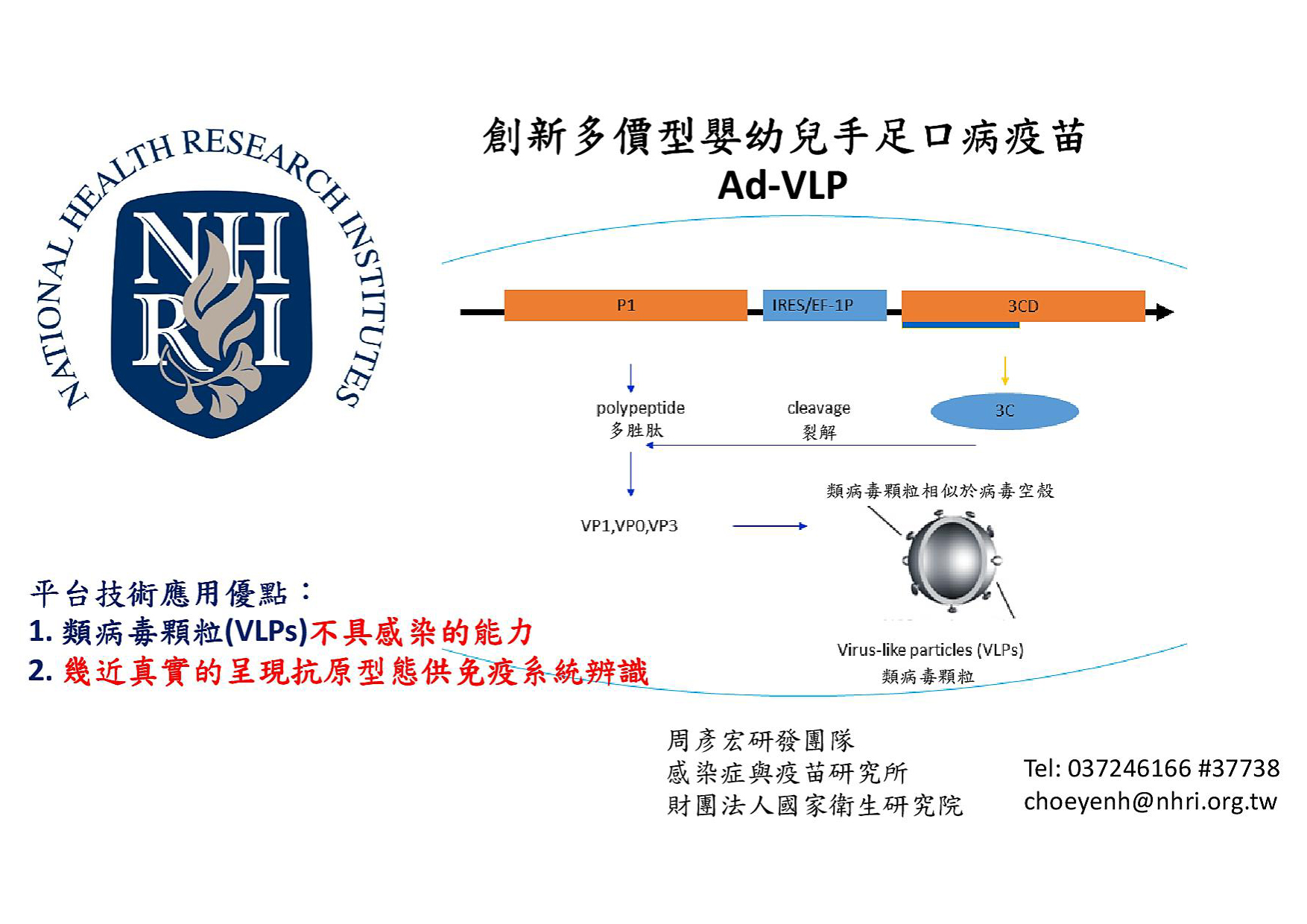 有別於過去減毒性腸病毒疫苗,Ad-VLP疫苗是一個新的技術平台,利用腺病毒載體攜帶不具毒性的腸病毒類病毒顆粒,並能幾近真實的呈現抗原型態供免疫系統辨識,引發正確的免疫保護作用。團隊並且運用其全球首創,符合人體病理反應的腸病毒感染實驗動物模式hSCARB2基因轉殖鼠進行試驗,準確測試Ad-VLP疫苗效力。