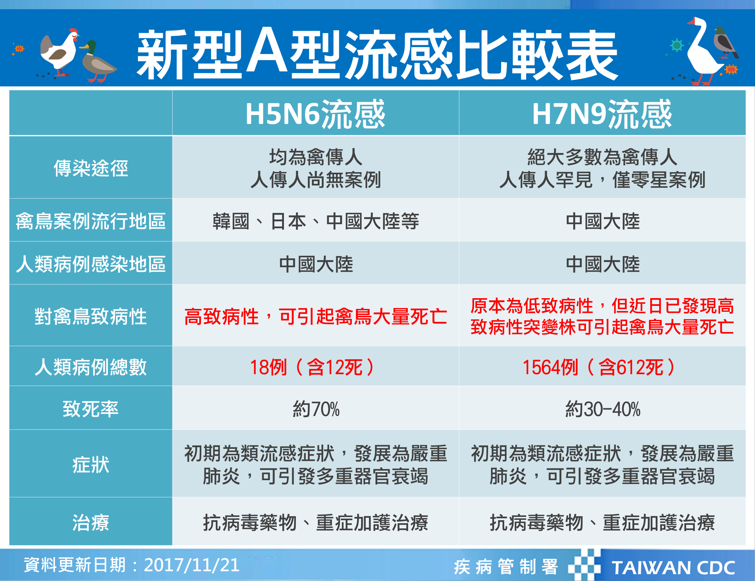 另中國大陸國家衛生和計畫生育委員會11月20日公布新增1例 H5N6流感病例,為本流行季(2017年10月迄今)首例,為廣西壯族自治區貴港市33歲男性,發病前曾接觸活禽及曾至活禽市場,11月7日發病,11月12日住院治療,目前病況嚴重。全球自2014年迄今累計18例,均發生於中國大陸,為散發病例,以廣東省6例為多,餘分布於湖南省、雲南省、廣西壯族自治區、四川省、安徽省、江西省、湖北省等計8省;迄今累計12例死亡,致死率70%;逾七成個案為20至49歲;逾八成具禽類或活禽市場暴露史。