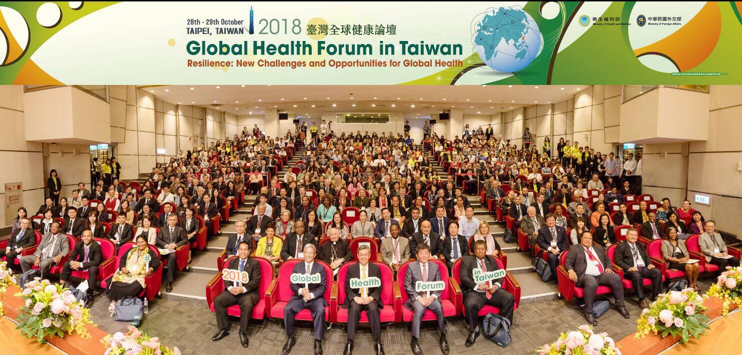 「2018臺灣全球健康論壇(2018 Global Health Forum in Taiwan)」於10月28日至29日由衛生福利部及外交部共同舉辦,論壇主題為「韌力、復原力:全球健康的挑戰與契機(Resilience: New Challenges and Opportunities for Global Health)」,共同探討在衛生健康照護系統不斷變化的壓力中,包括各種多變天然災害、人為災害及各種文明疾病盛行等,如何發揮韌力以應對各種挑戰,為未然準備。會議廣邀國際知名專家與國內學界、公部門與專家等共同腦力激盪,共商如何透過有效計畫以全面落實永續發展目標。此次有來自34個國家含國內外計68位講者官員及國內各領域專家約超過1,200人參與。