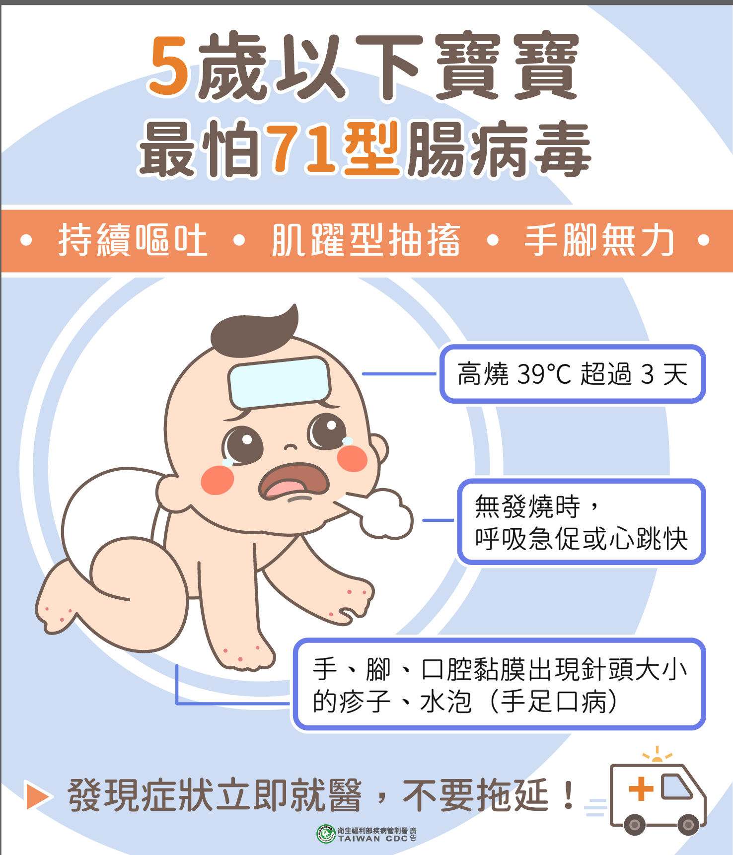 疾管署表示,2名重症個案分別為北部女童(6-10歲)及中部男童(不足1歲),發病日分別為7月6日及7月10日。北部女童因發燒就醫,因症狀持續並出現嗜睡、疱疹性咽峽炎及運動失調等症狀,再次就診後收治住院;中部男童係因發燒、口腔潰瘍、足底紅疹就醫,之後因食慾不佳,且出現肌抽躍及右上肢無力,經住院治療病況改善,目前2人均已出院。