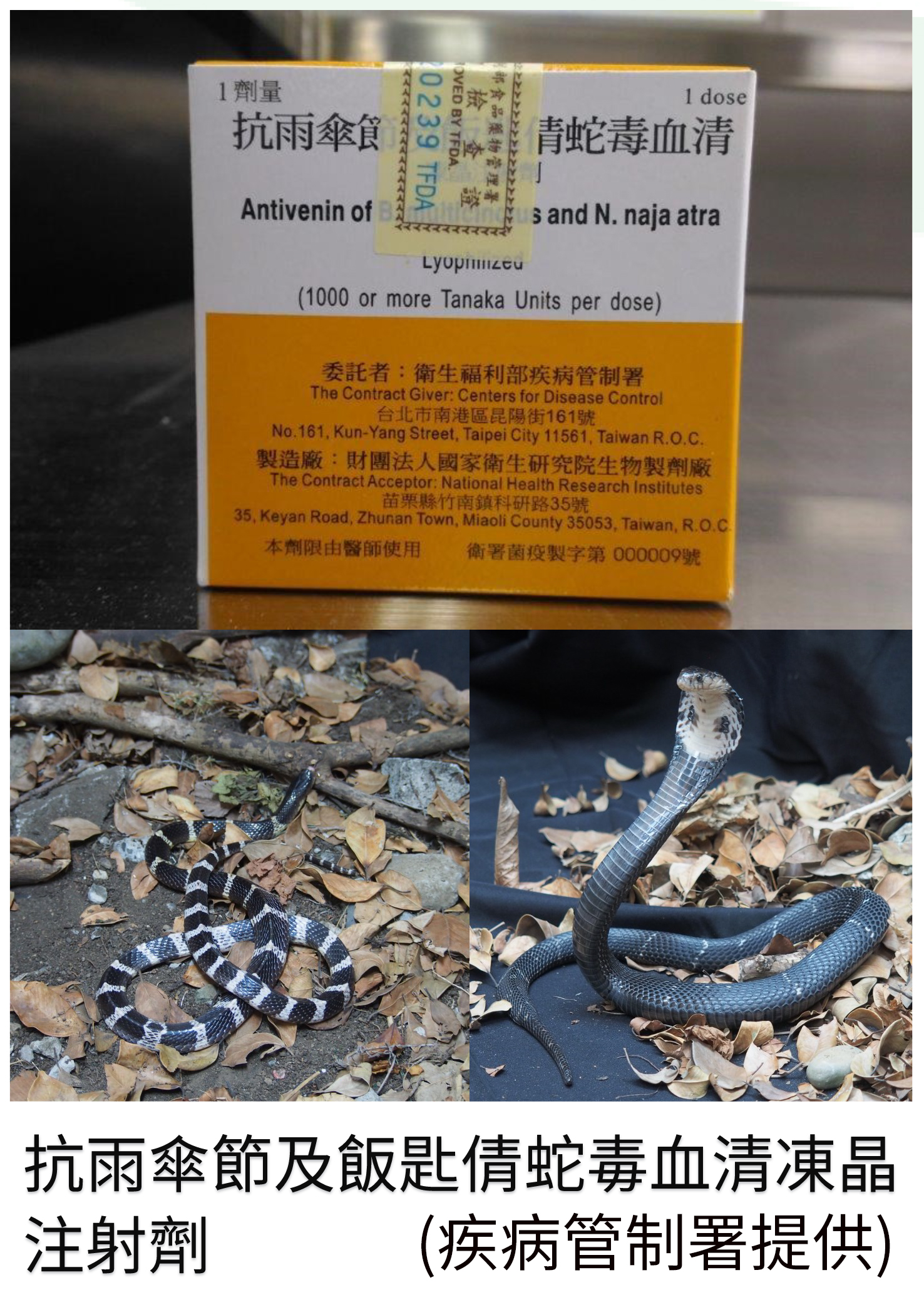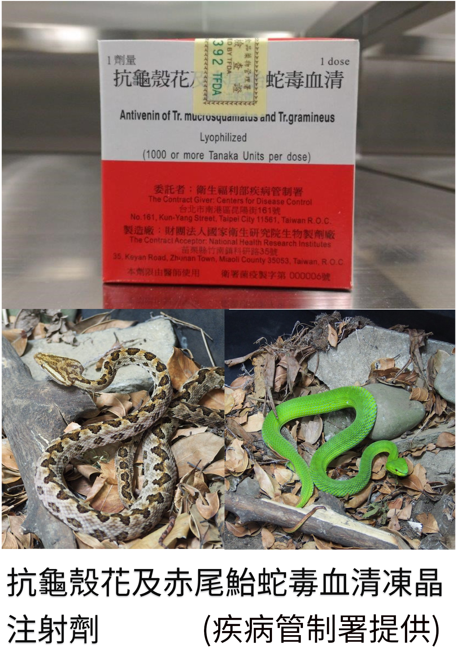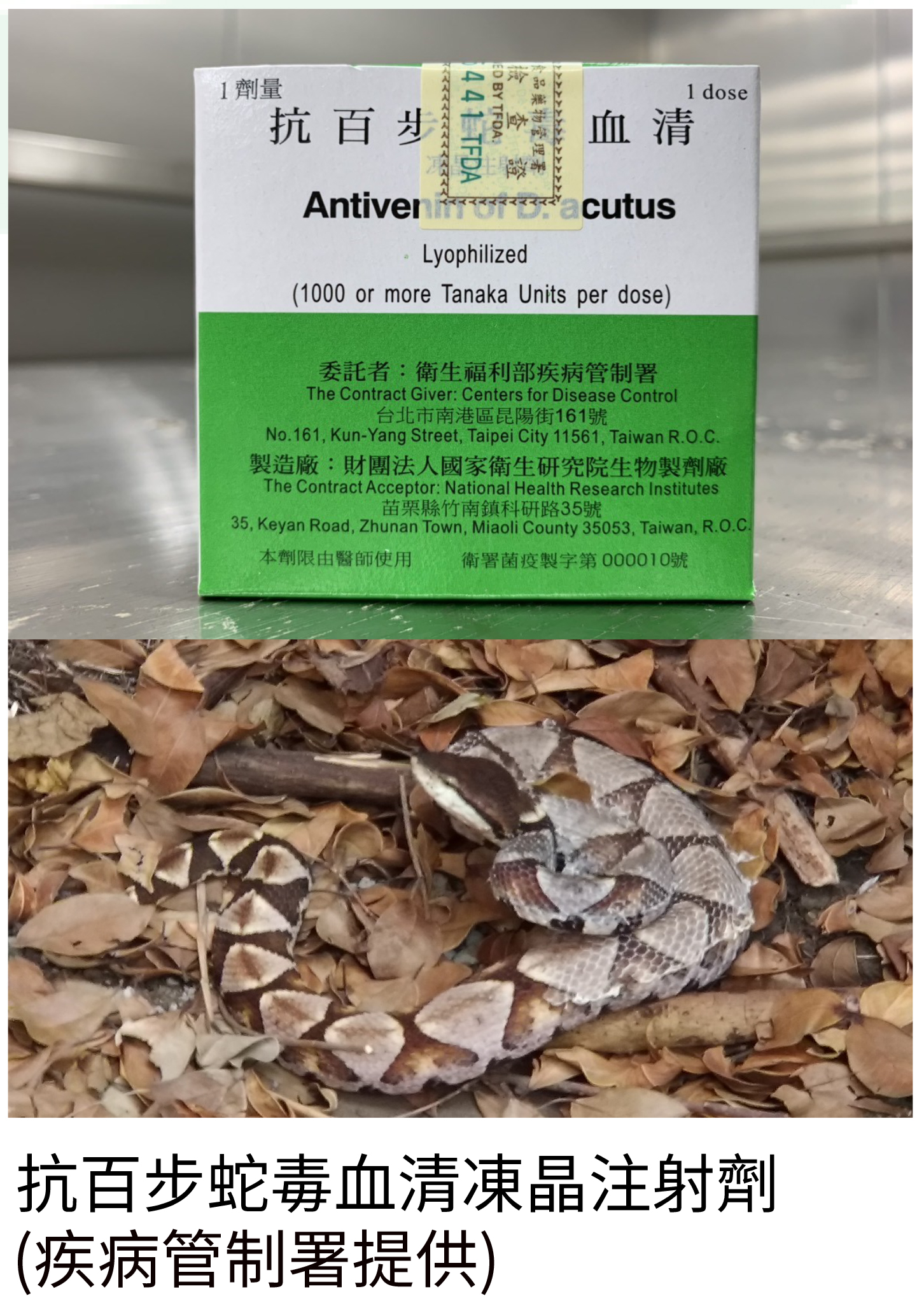 疾管署表示,每年約有1,000名以上民眾遭毒蛇咬傷,國內較常見的毒蛇分別為出血性毒的龜殼花、赤尾鮐(俗稱赤尾青竹絲)與百步蛇;神經性毒的飯匙倩(俗稱眼鏡蛇)與雨傘節,以及兼具出血和神經毒的鎖鏈蛇。被毒蛇咬傷的治療方式為注射抗蛇毒血清,疾管署為全國目前唯一生產供應抗蛇毒血清機構,為避免國人因毒蛇咬傷而危及性命,疾管署於全國200多家醫療院所備有抗蛇毒血清供民眾救急,由於抗蛇毒血清為醫師處方用藥,民眾如有使用需求可先透過「抗蛇毒血清儲備點查詢系統」(https://mis.cdc.gov.tw/PLC/PLC_QR001.aspx),查詢鄰近醫療院所抗蛇毒血清的儲備情形,切勿購買來路不明藥物。