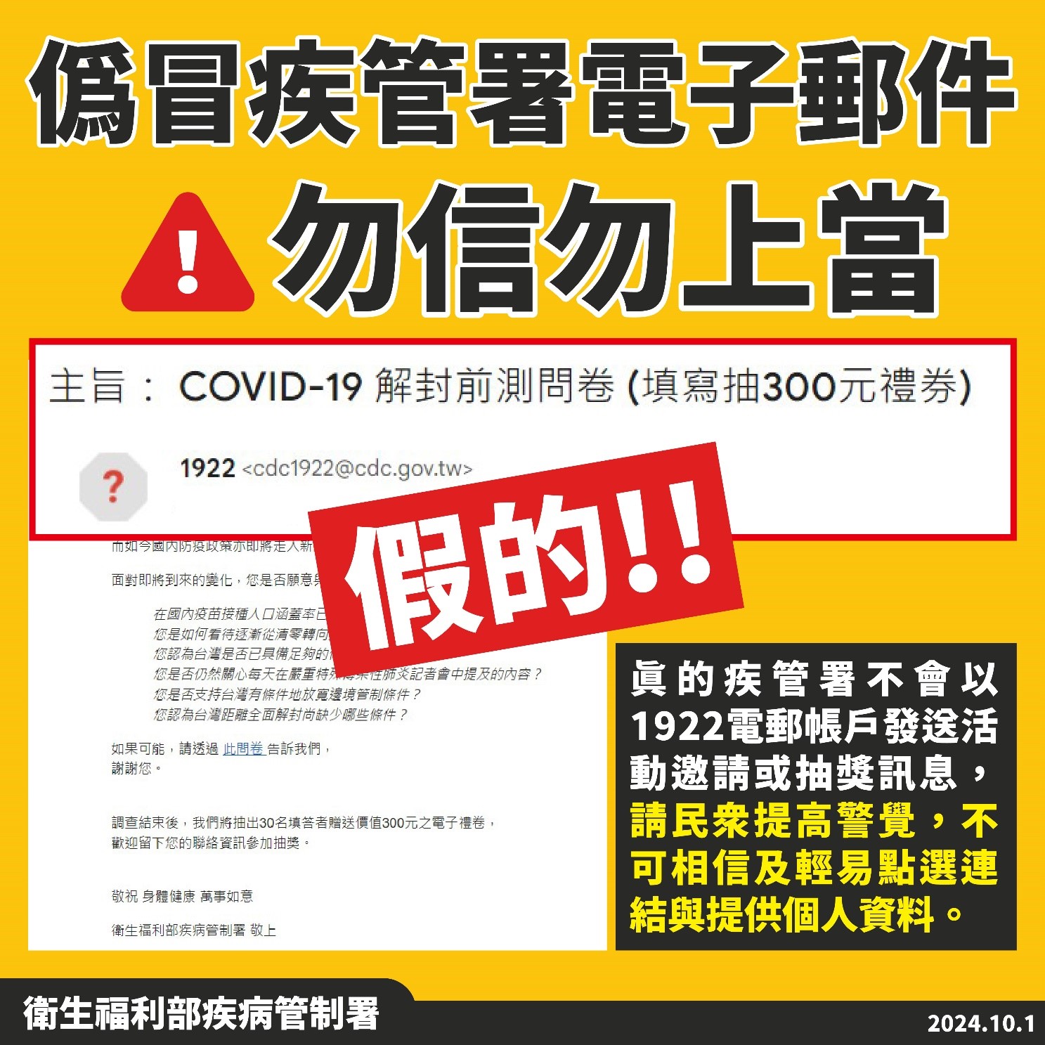 近日有民眾接獲「COVID-19解封前測問卷(填寫抽300元禮券)」等活動邀請或抽獎電子郵件,寄件者及內容假冒疾病管制署名義,誘導民眾點擊惡意網址及提供個人資料等。疾管署澄清,此電子郵件並非官方寄送,提醒民眾提高警覺,不可相信及輕易點選連結或填寫資料。