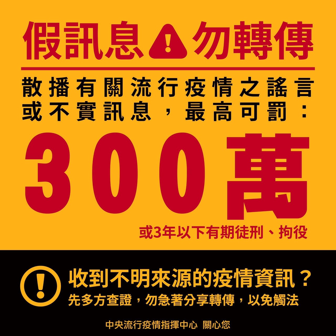 指揮中心表示,我國已於12月1日起強制要求民眾於八大類場域務必佩戴口罩,未佩戴口罩且經勸導不聽者,才會依法開罰,目前並未有開罰之情事,並重申若接獲來源不明的疫情訊息,應先行查證,勿隨意散播,以免觸犯「嚴重特殊傳染性肺炎防治及紓困振興特別條例」第14條,或「社會秩序維護法」第63條第1項第5款規定。