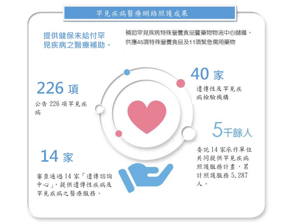 3. 辦理罕見疾病認定及個案通報,建置罕見疾病個案通報資料庫,截至109年10月共公告226項罕見疾病,通報1萬7,910人(其中死亡3,157人)。