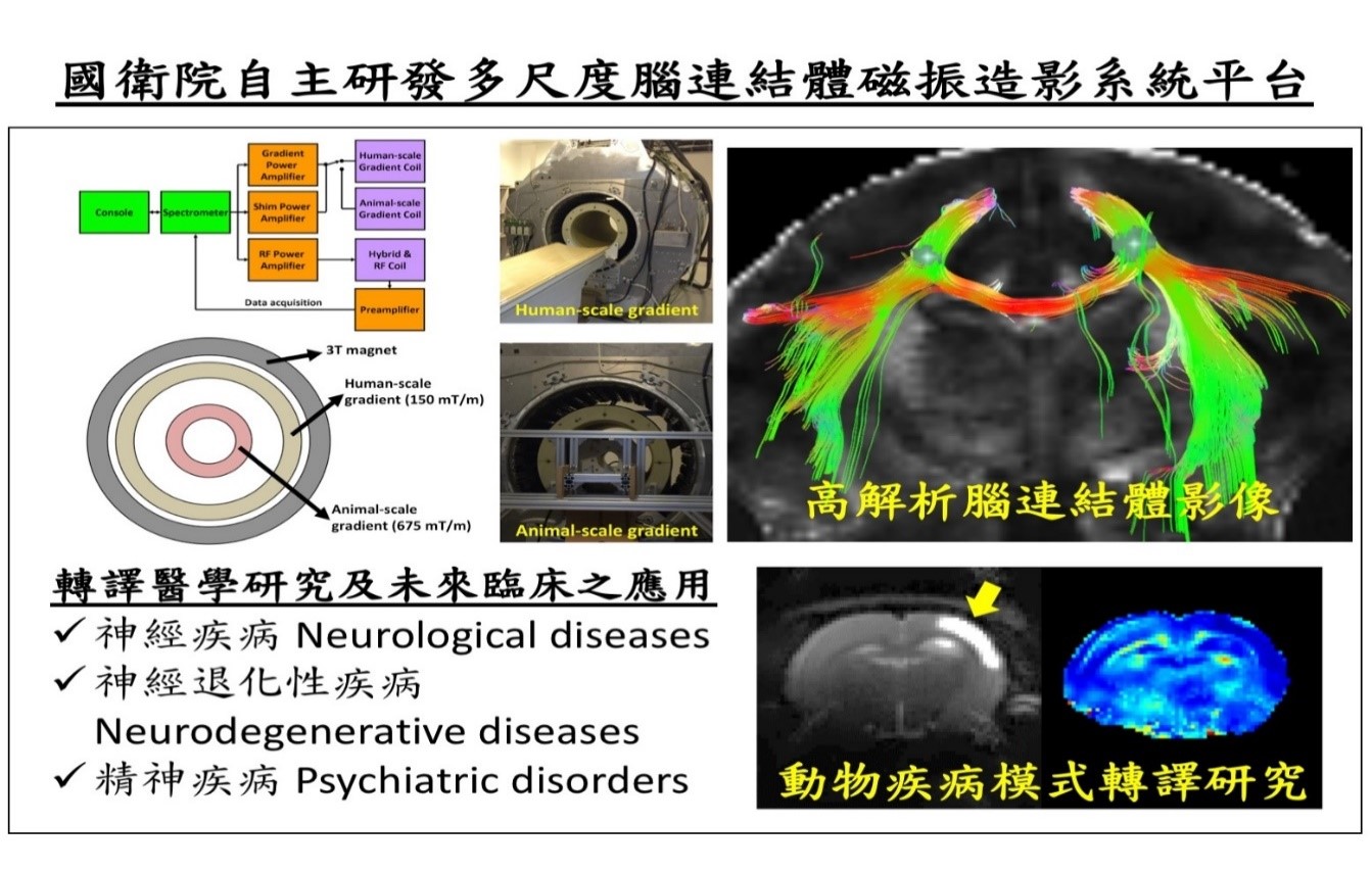 國家衛生研究院生醫工程與奈米醫學研究所生醫影像團隊在林峯輝所長、張恕客座研究員及郭立威副研究員的帶領下,並與國立台灣大學醫學院曾文毅教授團隊共同合作,透過衛福部、經濟部及科發基金的經費支持,經多年努力完成第一台我國自主研發之多尺度腦連結體3T磁振造影系統平台(Brain Connectome 3T MRI System Platform),未來將可透過不同尺度的梯度磁場系統進行臨床應用及臨床前動物模式的影像研究,研究成果已陸續發表於2019年《PLoS One》、《Journal of Magnetic Resonance Imaging》及《NMR in Biomedicine》國際知名期刊。