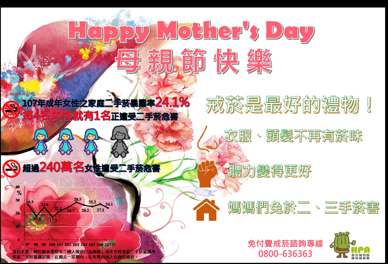母親節要到了,如果您還在吸菸,鼓勵您讓「母親節」成為您的戒菸日。國民健康署王英偉署長表示,有設定戒菸日的戒菸者比未設定者戒菸成功率約增加2成;成功戒菸後,不但自己的衣服、頭髮不再有菸味,體力也會變得更好,也讓媽媽們免於二、三手菸的健康危害,是最有意義的母親節禮物。