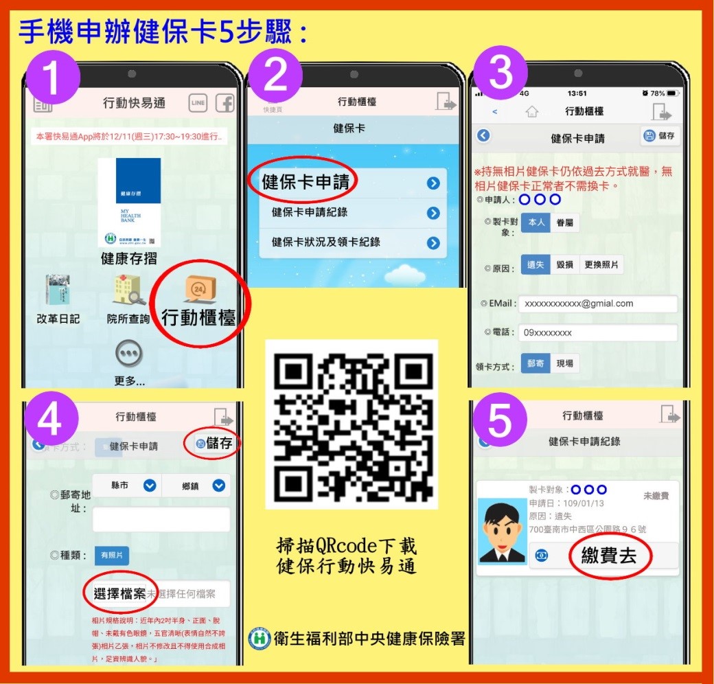 為節省民眾寶貴時間,健保署南區業務組表示,民眾只要以手機下載健保署「全民健保行動快易通」APP完成裝置認證,即可利用行動櫃檯健保卡申請功能,輸入個人資料、上傳相片、線上繳費,不用出門就可以用手機申辦健保卡,即使在年節期間也可以申請,在2~3個工作天就能收到健保卡。