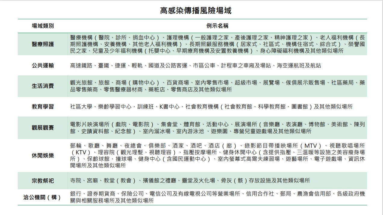 考量「醫療照護、公共運輸、生活消費、教育學習、觀展觀賽、休閒娛樂、宗教祭祀、洽公機關(構)」等八大類場所(場所舉例如附表)具有不易保持社交距離,或會近距離接觸不特定對象的特性,有較高的感染與傳播風險,為提高民眾於高感染傳播風險場所佩戴口罩遵循度,以降低COVID-19及其他各類經由飛沫、空氣傳播之呼吸道傳染病的感染與傳播,將持續強制要求民眾進入上述八大類場所應佩戴口罩,如果在上述場所內有飲食需求,在與不特定對象保持社交距離或有適當阻隔設備的前提下,可在飲食期間暫時取下口罩。未依規定佩戴口罩,經勸導不聽者,將依違反傳染病防治法第37條第1項第6款規定,由地方政府裁罰新臺幣3千元以上1萬5千元以下罰鍰。