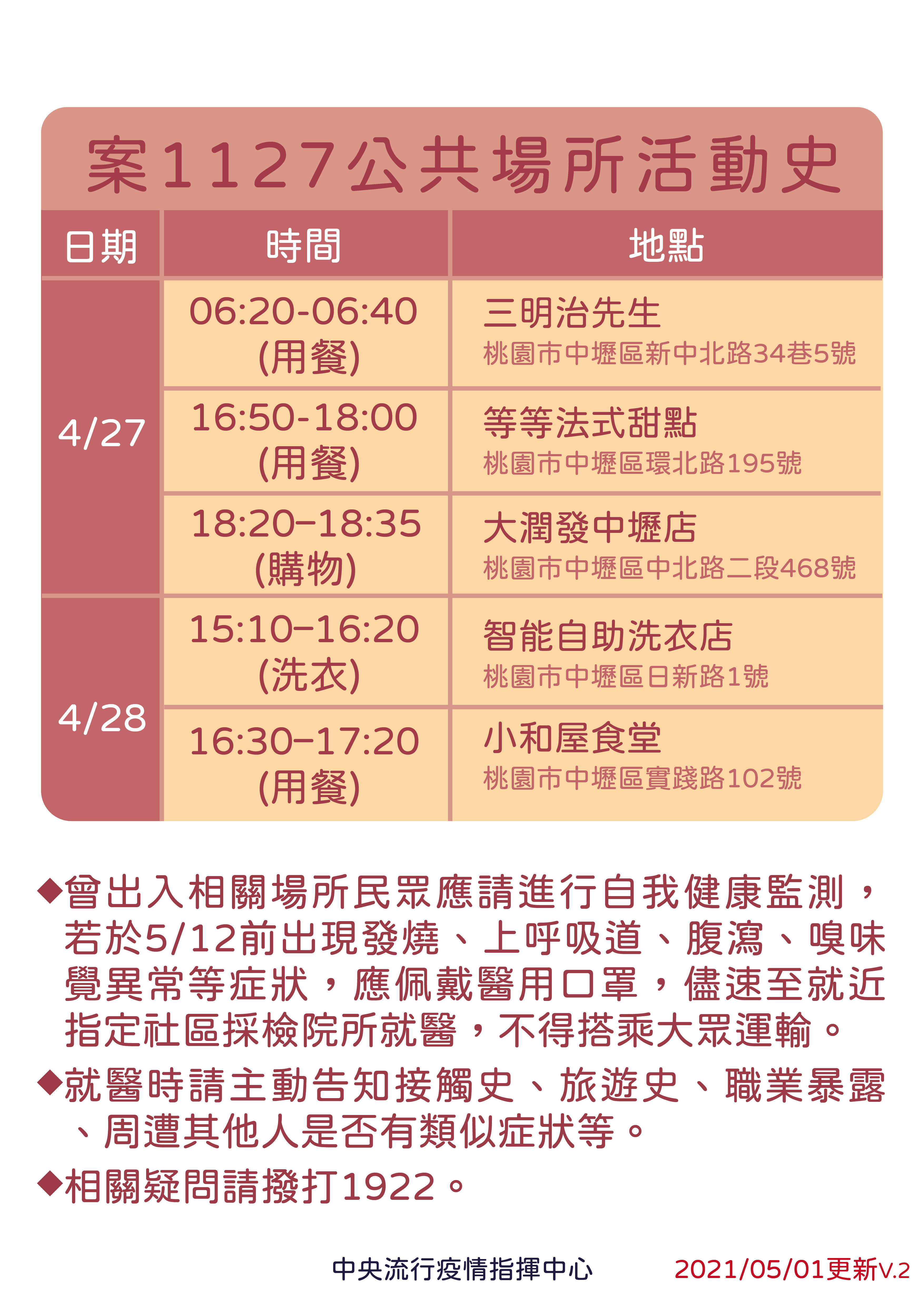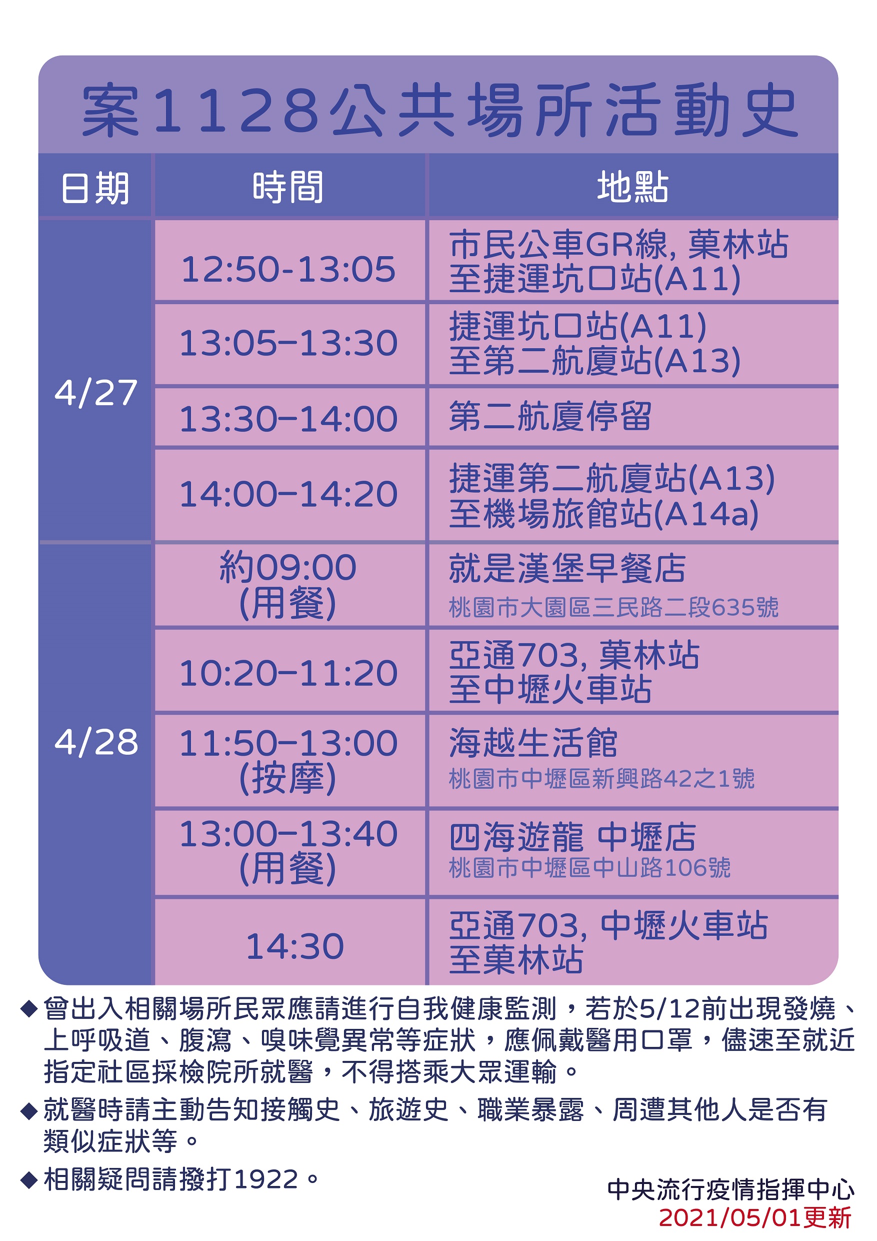 指揮中心指出,案1128為本國籍20多歲男性,為機場防疫旅館房務部員工,近期無出國史,昨日原預計依旅館清空計畫前往集中檢疫所,但因量測體溫有發燒情形,後送就醫採檢及隔離治療,於今日確診(Ct值16)。已初步掌握個案接觸者4人,皆列居家隔離對象。 指揮中心表示,案1129為本國籍60多歲女性,為機場防疫旅館房務部員工,近期無出國史,4月26日曾出現輕微咳嗽及喉嚨痛症狀,並自行購買成藥服用,昨日依旅館清空計畫前往集中檢疫所,並於檢疫所內進行採檢,於今日確診(Ct值20)。已初步掌握個案接觸者4人,皆列居家隔離對象。