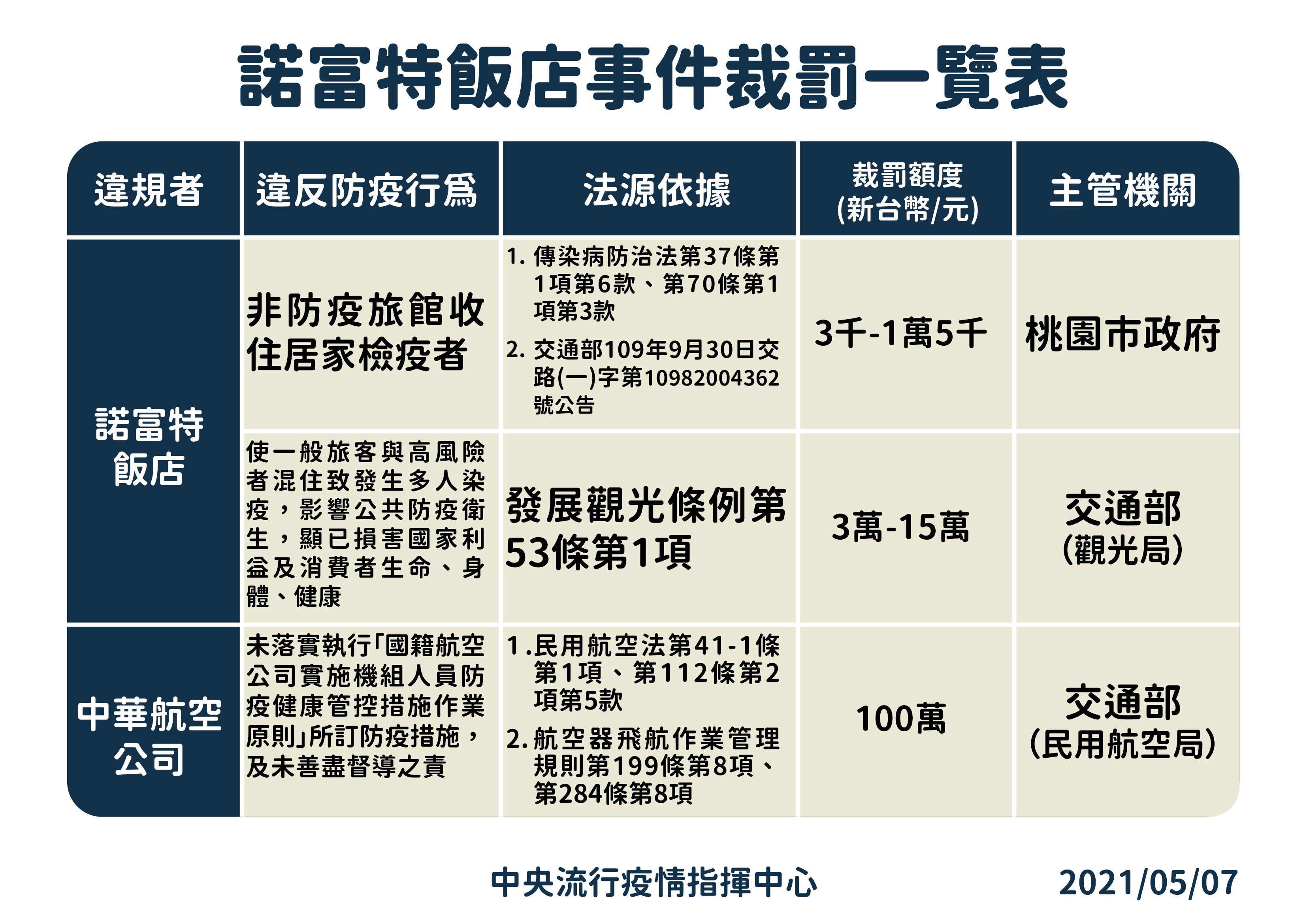 指揮中心指出,會中確認該飯店一館7樓、8樓是作為華航公司員工防疫宿舍,並非桃園市政府核可之防疫旅宿;而該飯店於一館8樓同時收住一般旅客及居家檢疫機組員之行為,違反發展觀光條例第53條第1項、傳染病防治法第37條第1項第6款規定;另華航公司對於員工防疫宿舍管理監督亦有不當,違反民用航空法第112條第2項第5款規定,分別由交通部與桃園市政府進行裁罰。
