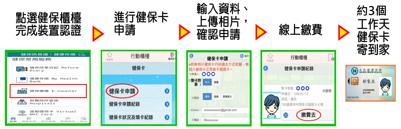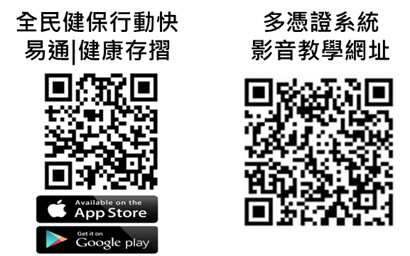 一般民眾:透過「全民健保行動快易通」APP的「健保櫃檯」,可申請健保卡、辦理公所投保保險對象之加退停復保、查詢未繳保費及繳納健保費等各項服務。至於健保卡已遺失無法完成裝置認證者,投保於同一健保戶的家人可代為申請。