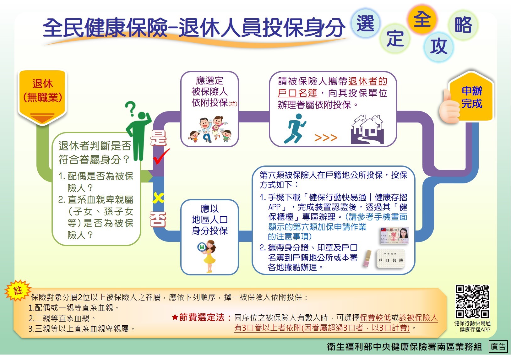 健保署南區業務組林純美組長表示,全民健康保險為強制性的社會保險,被保險人依職業屬性分成六種類別,應依規定的順位在其所屬投保單位投保。無工作並且符合眷屬身分者,則應依附被保險人(配偶、子女、孫子女)投保。民眾退休,原投保單位會於3日內辦理退保(轉出)手續,建議參照「投保身分選定全攻略」(如附圖),選定投保身分後,即可至被保險人所屬的投保單位申請投保。如因故致投保有中斷投保情形,將影響健保卡使用,嗣後也會被追溯補收中斷投保期間的健保費。民眾如有投保疑問,歡迎撥打健保署諮詢專線,市話請撥打0800-030-598或4128-678,手機請改撥(02)4128-678。