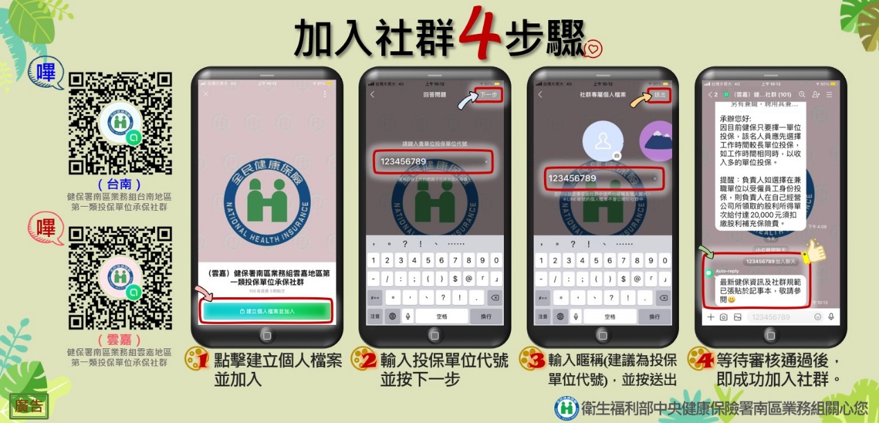 林組長進一步指出,投保單位社群自今年6月成立迄今,已有近200家投保單位加入,頗受單位好評。未來該業務組服務型態將會隨著科技進步與時俱進,持續推動投保單位更便利、即時的服務。雲嘉南地區的投保單位可參考下列圖示步驟申請加入社群,相關作業如有不清楚或有疑問,可撥打該業務組諮詢電話06-2245678轉分機1602、1603洽詢。