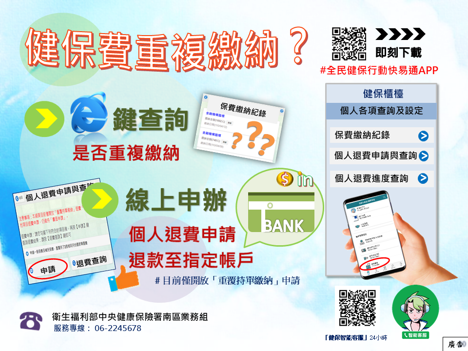 「自己已利用行動支付掃描繳款單上的QR Code繳完健保費,家人沒注意又去超商重覆繳了ㄧ次」、「想要申請退費,但又不想跑去臨櫃辦理」、「收到退費支票,怕不小心遺失又怕逾期未領」。近年來因為健保費有多元的繳納方式,有時會發生民眾重複繳費的情形,健保署南區業務組表示,民眾只要透過「全民健保行動快易通APP」的「健保櫃檯」,即可線上查詢是否重複繳費及申辦退費,並填妥轉帳退費帳戶資料後,健保署即可將退費直接匯入指定帳戶,省下支票託收兌現的手續。