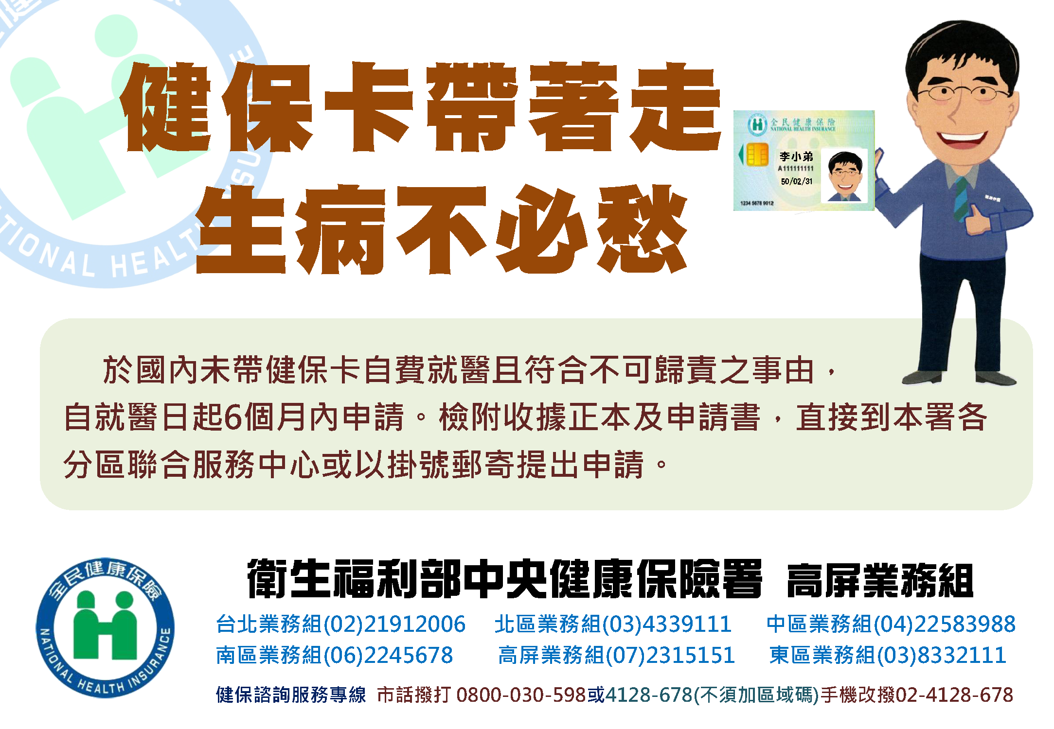 健保署關心您的健康與權益,再次提醒大家,外出時別忘了「健保卡帶著走,生病不必愁」!