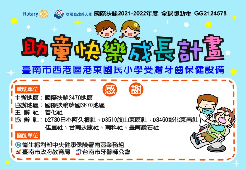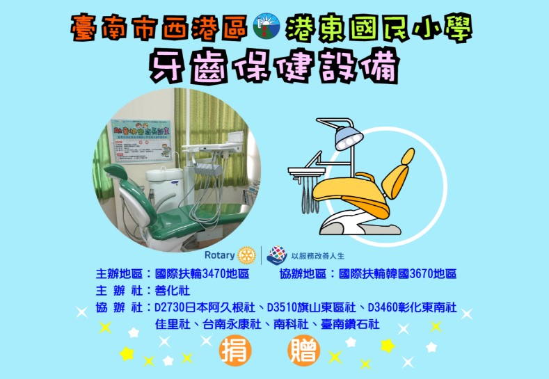 這項「助童快樂成長計畫-臺南偏鄉小學牙齒保健設備」計畫,要感謝國際扶輪3470地區的善化社、佳里社、永康社、南科社、鑽石社等社申請全球獎助金,並偕同國際扶輪3510地區的旗山東區社、D3460彰化東南社等社及國外國際扶輪3670(韓國) 及2730(日本阿久根)等地區扶輪社共同捐款,並獲臺南市維康牙醫診所林祺晟醫師支持,無償捐贈診療椅乙臺共襄善舉,共募得5套牙科診療設備,近日內即可啟用。