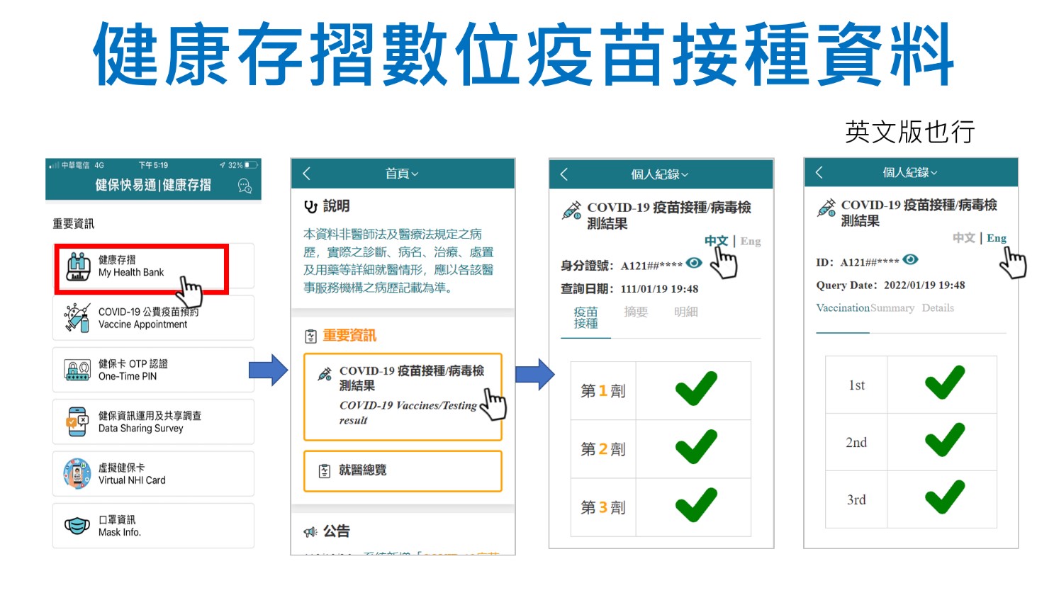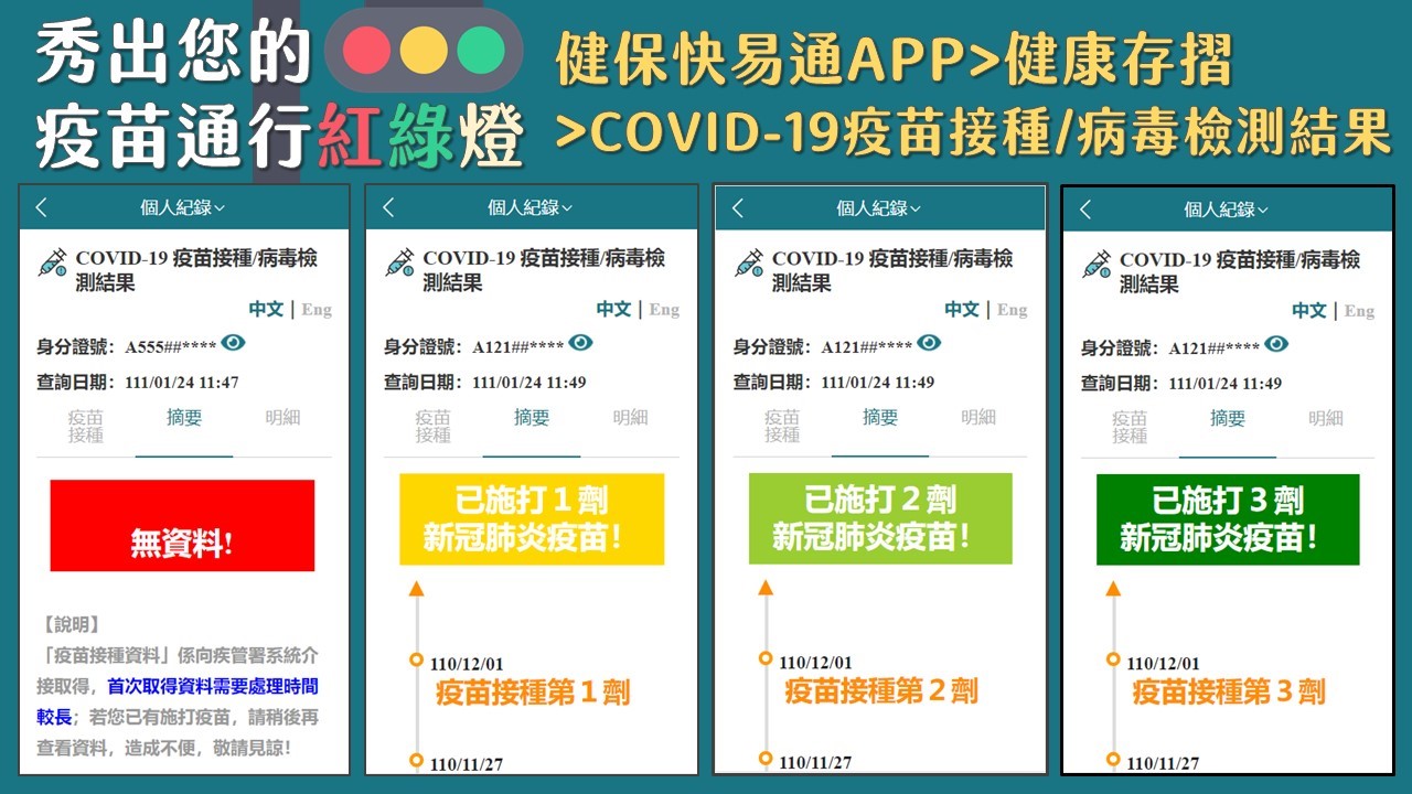 即日起,透過「全民健保行動快易通|健康存摺APP」(簡稱「健保快易通APP」)中的健康存摺,打開「COVID-19疫苗接種/病毒檢測結果」即可秀出疫苗通行紅綠燈,打過疫苗的您,只要出示就能讓您於國內不同場所快速通關!