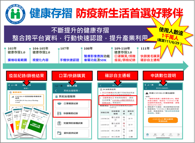 健保署表示,103年9月「健康存摺」網頁版上線,希望建立一個民眾自我健康照護的整合平台;因應行動裝置使用習慣興起,「健保快易通APP」於104年納入「健康存摺」服務;為了讓民眾在安裝APP時容易查找,遂於109年5月將APP更名為「全民健保快易通|健康存摺APP」,至111年6月25日下載次數達1,994萬次。配合中央流行疫情指揮中心政策,「健康存摺」呈現防疫物資(口罩、家用快篩試劑)的實名制購買紀錄,整合「COVID-19疫苗接種/病毒檢測結果紀錄」,成為民眾疫苗施打紀錄視覺化及快速查看PCR檢測結果的最佳數位工具,亦可連結疾管署「COVID-19確診個案自主回報系統」填寫疫調資料、申請COVID-19數位證明,用科技輔助防疫。