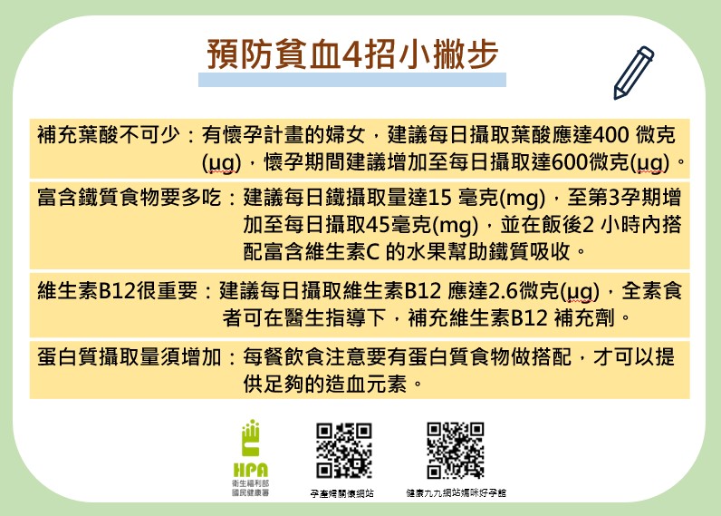 國民健康署吳昭軍署長提醒孕媽咪,如果檢查結果有貧血情形,除須遵從醫囑適時使用營養補充品外,也提供下列4招預防貧血小撇步: