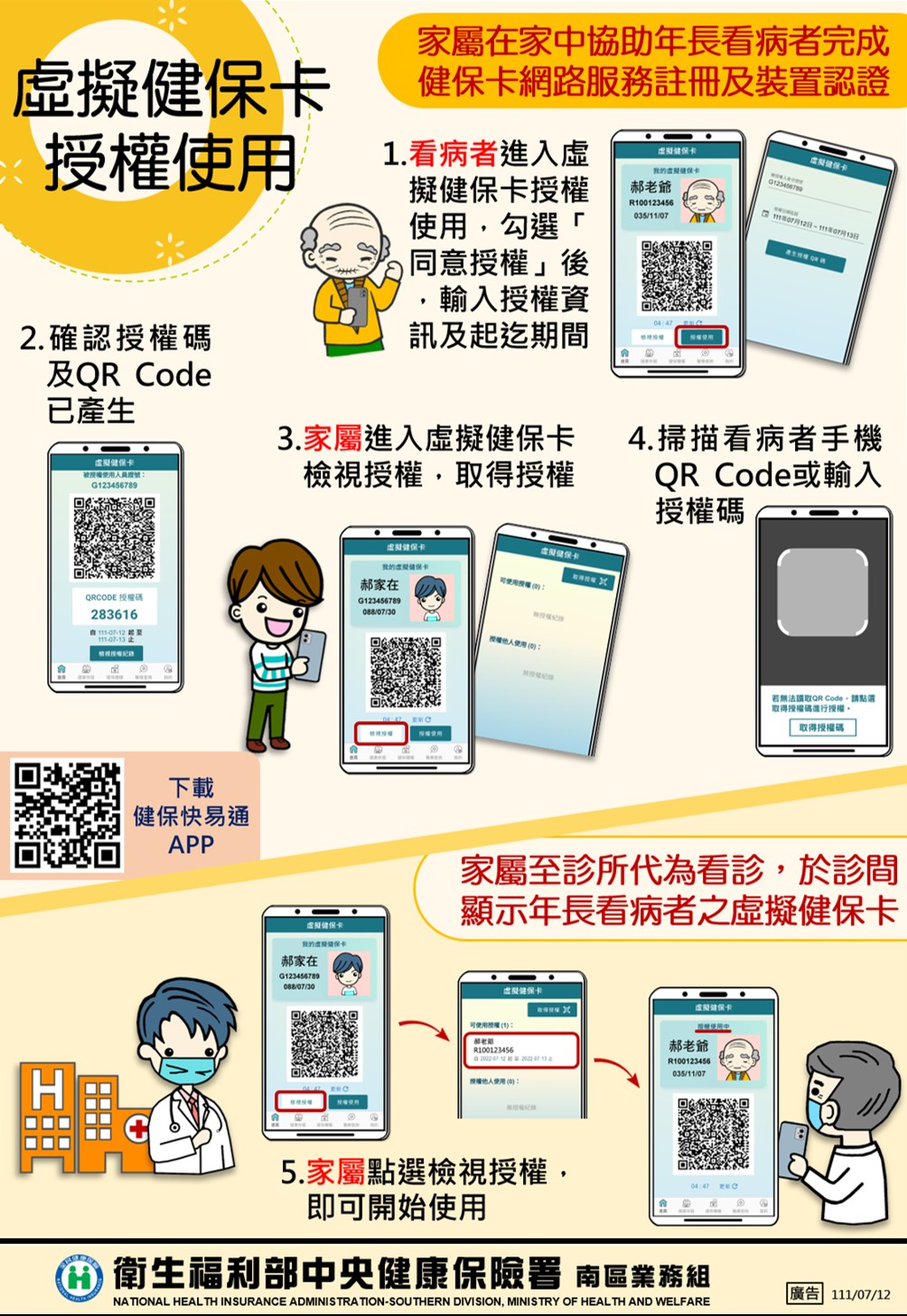 具有慢性病史之78歲李先生(化名)COVID-19確診後,在家隔離時出現發燒、全身痠痛、咳嗽、流鼻水等症狀,因無法外出就醫亦不會使用3C產品進行視訊診療,女兒心急電話求助家庭醫師-天德內小兒科診所詹家明醫師診治詹醫師先指導女兒虛擬健保卡授權綁定,向健保署南區業務組報備後,以電話問診李先生病情,並請女兒出示李先生虛擬健保卡QR Code完成讀卡取號並開立處方。詹醫師表示使用虛擬健保卡進行通訊診療,除了零接觸降低染疫風險外,亦可減少基本資料誤植困擾;另外,透過授權綁定虛擬健保卡,更可解決長者不諳3C困擾,是全民防疫就醫好幫手。