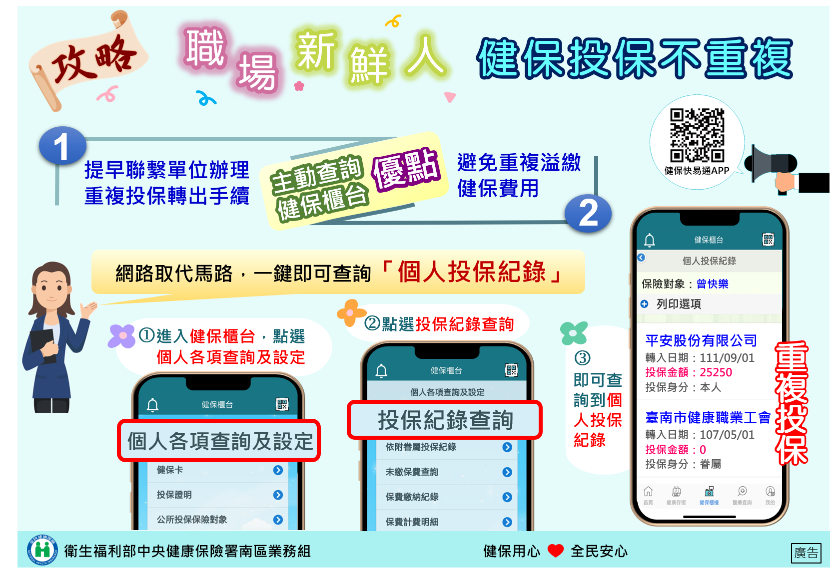 剛畢業的靜文(化名)是在科技公司任職的職場新鮮人,最近收到健保署重複投保轉出通知單,在求學期間的健保依附於父親,在職業工會以眷屬身分投保且仍在保中,以致產生重複繳納健保費的情形。健保署建議像靜文一樣的職場新鮮人,可透過手機下載「全民健保行動快易通」APP,點選「健保櫃檯」查對自己的健保是否有重複投保。