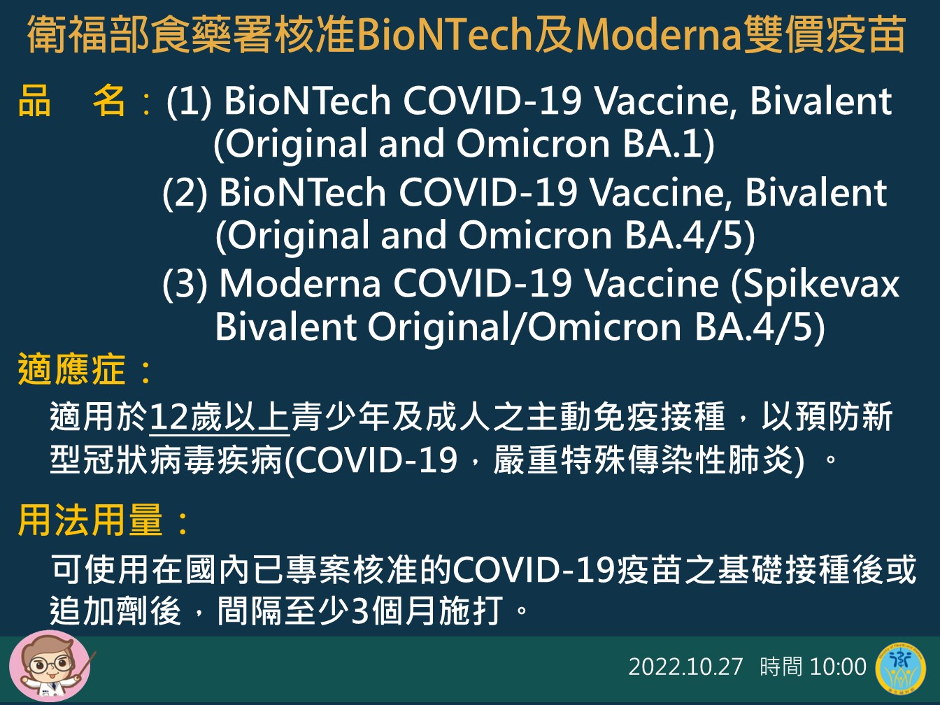 食藥署表示,經審查BioNTech BA.1及BA.4/5與Moderna BA.4/5雙價疫苗所附資料,根據原型株疫苗的安全性及效益資料、BA.1雙價疫苗的人體臨床試驗結果及BA.4/5雙價疫苗的動物試驗結果,BA.1雙價疫苗相較於原型株疫苗作為追加劑,能夠誘發較優的對抗Omicron變異株的中和抗體免疫反應,而由於BA.4/5雙價疫苗與BA.1雙價疫苗具相同的製程及相似的組成,預期也能夠誘發較優的對抗Omicron變異株的中和抗體免疫反應。另外相關動物試驗結果顯示,BioNTech 及Moderna BA.1及BA.4/5雙價疫苗均具有良好的對抗Omicron病毒變異株的效果。在安全性資料方面,施打BA.1或BA.4/5雙價疫苗追加劑發生的局部/全身性不良反應頻率,皆與原型株疫苗相似,以輕中度不良反應為主,且無偵測到新的安全性訊號。