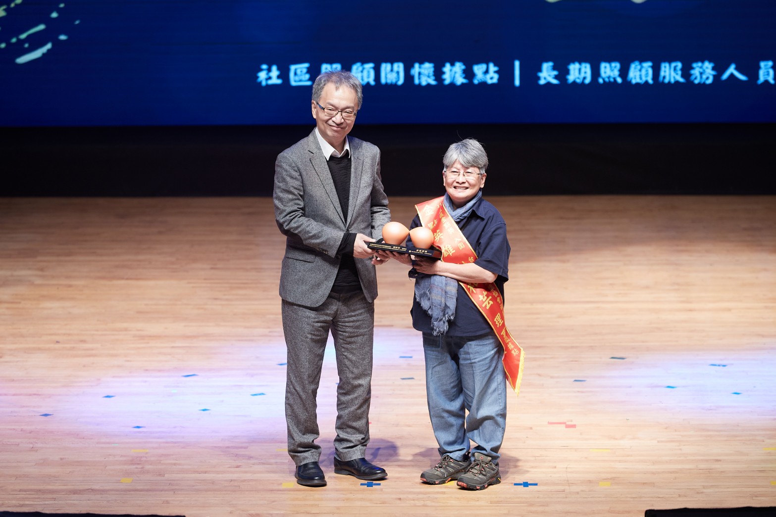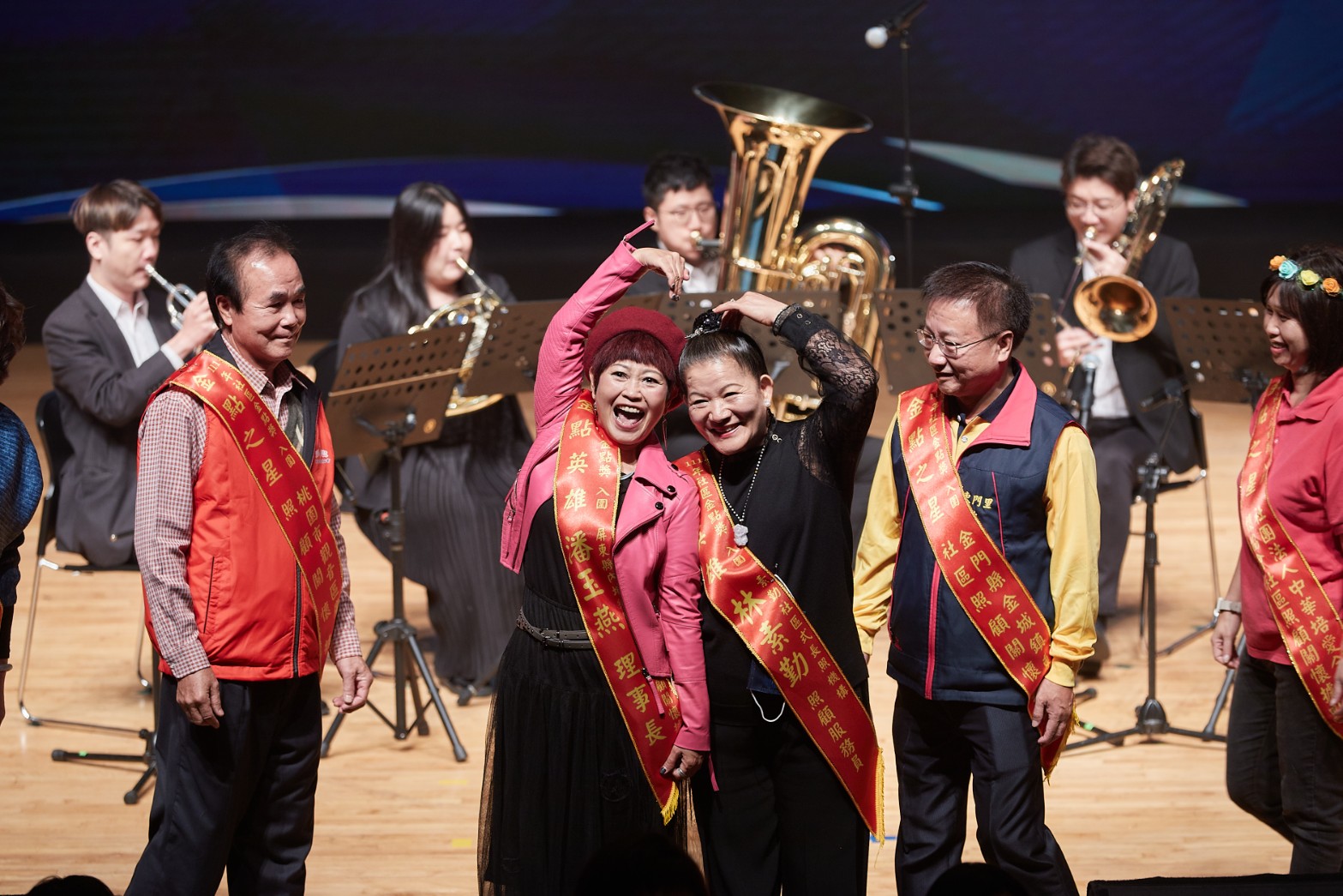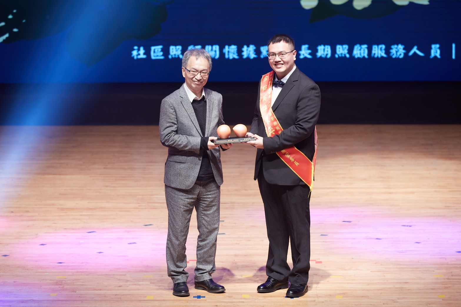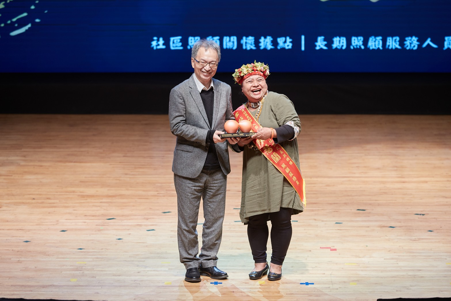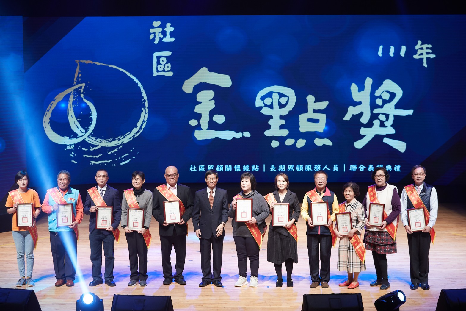 本年度頒奬典禮在藝聲管樂團的樂音引導下,讓入圍者在眾人的喝采聲中隆重入場,拉開序幕;在中場時段,則邀請去年獲獎單位「高雄市活泉愛鄰社區服務協會社區照顧關懷據點」帶來勁歌熱舞,由據點長者們的精湛舞藝,為表揚典禮帶來滿滿的能量與活力;藉由長者們熱情演出,告訴社會大眾,有政府積極推動據點與長照服務,面對即將到來的超高齡社會,大家不用擔心。