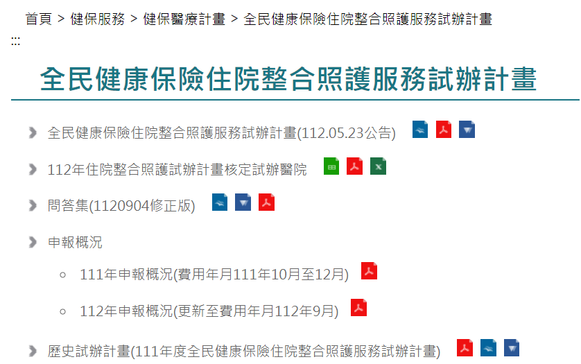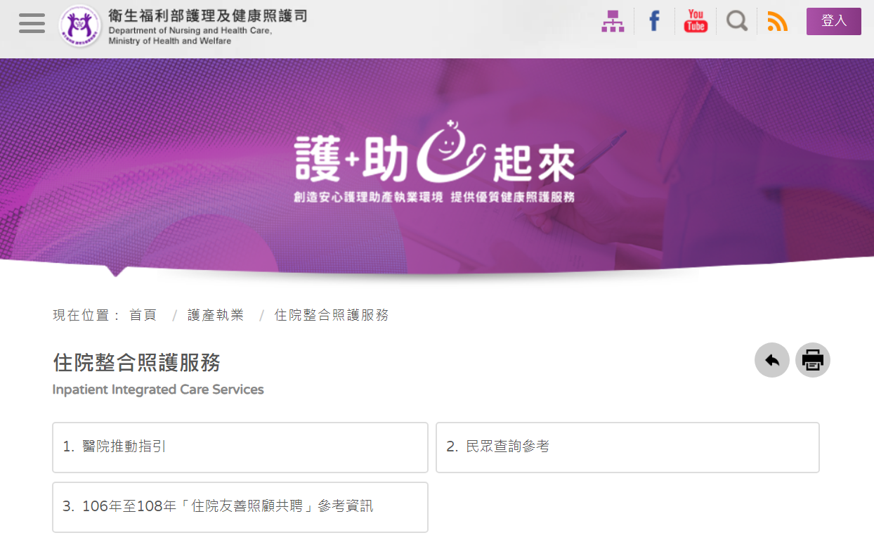 中央健康保險署為減少「一人住院,全家輪流陪住」的困境,自111年7月18日公告「全民健康保險住院整合照護服務試辦計畫」,醫院於一般急性病床安排適當護理及照護輔佐人員共同照護(非專屬一對一照顧服務),讓病患住院期間獲得連續性及完整性的照護,提升住院醫療照護品質,亦可適量減輕護理人員工作負荷。