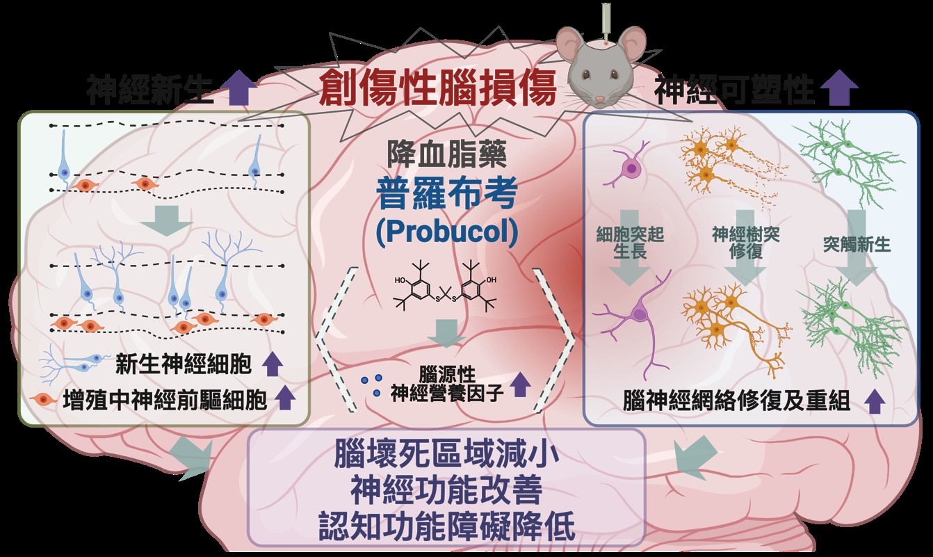 研究團隊於小鼠模式發現:在腦損傷後給予普羅布考,腦源性神經營養因子之表現增加,新生神經細胞及增殖中之神經前驅細胞增加一倍,腦壞死區域減小33%;腦神經網絡修復及重組亦受到促進,壞死腦區四周神經樹突及突觸皆大幅增加,並和腦損傷後運動功能成正比,顯示普羅布考可透過促進腦神經可塑性,改善腦損傷後之神經功能。同時,普羅布考也可以降低腦損傷所引之認知障礙,記憶功能大幅改善,有可能可以降低倖存者罹患失智症之風險。此研究成果於今(112)年6月發表於國際知名期刊《British Journal of Pharmacology》。