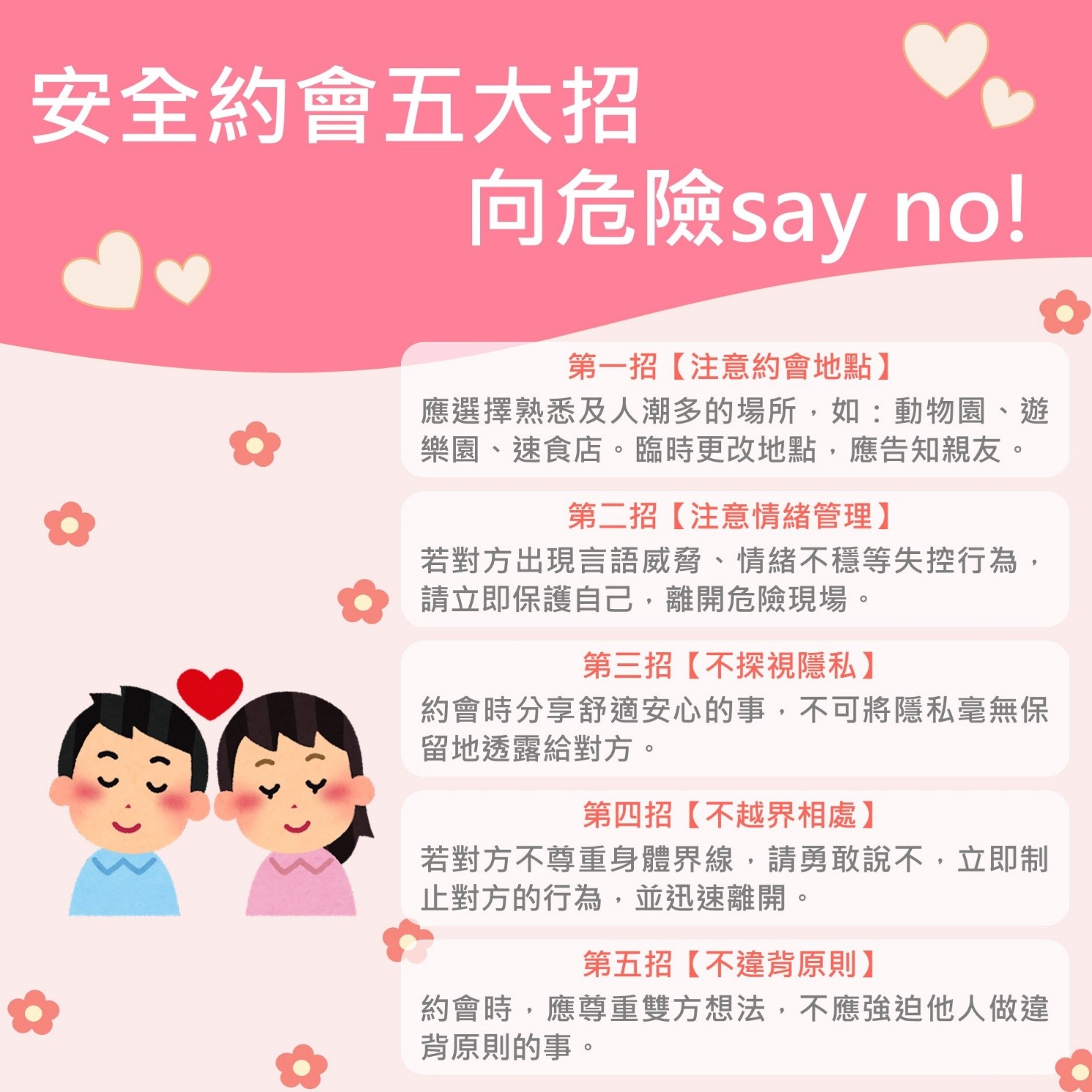 為保護青少年約會安全,國民健康署提出約會五大招,當約會過程中對方有任何行為讓自己感到不舒服時,要勇敢拒絕對方,或尋求家人、朋友及專業人員的幫助。