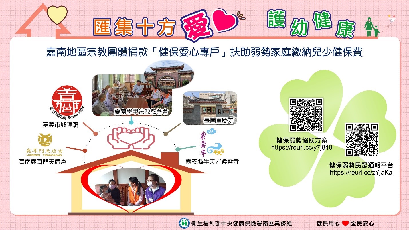 中央健康保險署為扶助弱勢邊緣戶家庭,主動積極尋求民間在地宗教資源,成功轉介臺南市學甲法源禪寺慈善會認養14位弱勢兒少未來每月的健保費,亦獲得臺南市重慶寺、鹿耳門天后宮、嘉義市城隍廟、嘉義縣半天岩紫雲寺等捐款「健保愛心專戶」,協助弱勢兒少繳清健保欠費,為受助者注入善能量。