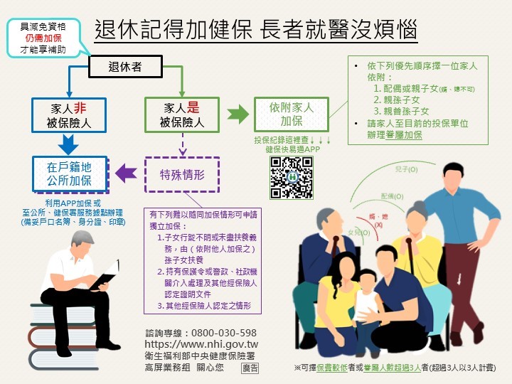 健保署高屏業務組林淑華組長表示,若民眾退休時有配偶或成年之直系血親卑親屬(子女或孫子女)為被保險人,就應以眷屬身分依1.配偶或一親等直系血親(子女)、2.二親等直系血親(孫子女)、3.三親等以上直系血親(曾孫子女)之順序,擇一人依附加保,並洽依附家人目前加保的投保單位協助辦理加保手續及扣收保險費。另外,退休民眾如無婚姻關係、配偶雙方皆退休且無直系血親卑親屬可依附或有法定難以隨同被保險人加保之特殊情形者,則應以第六類被保險人身分至戶籍地公所辦理加保手續。