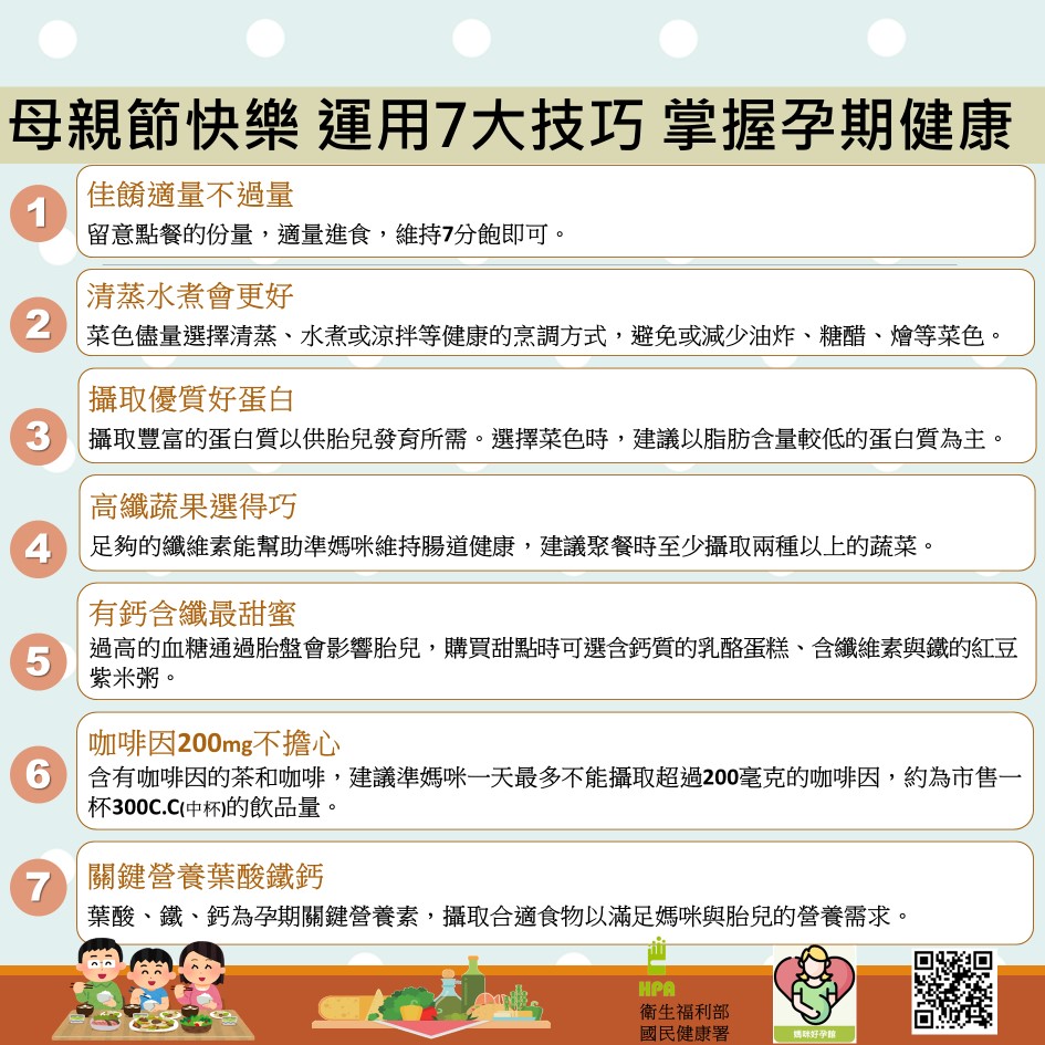 在母親節這個特別的日子,多一點健康餐食的選擇,一起享受「聰明吃」的美好體驗,讓準媽咪度過一個健康、愉快的節日。準爸媽們如有孕期營養或孕產婦照護相關問題,可至國民健康署健康九九+網站-孕媽咪好孕館,或是孕產婦關懷網站查詢相關資訊,或撥打孕產婦關懷諮詢專線0800-870-870(國語諧音:抱緊您,抱緊您),將有專業人員為您服務,歡迎準爸媽們多加利用。