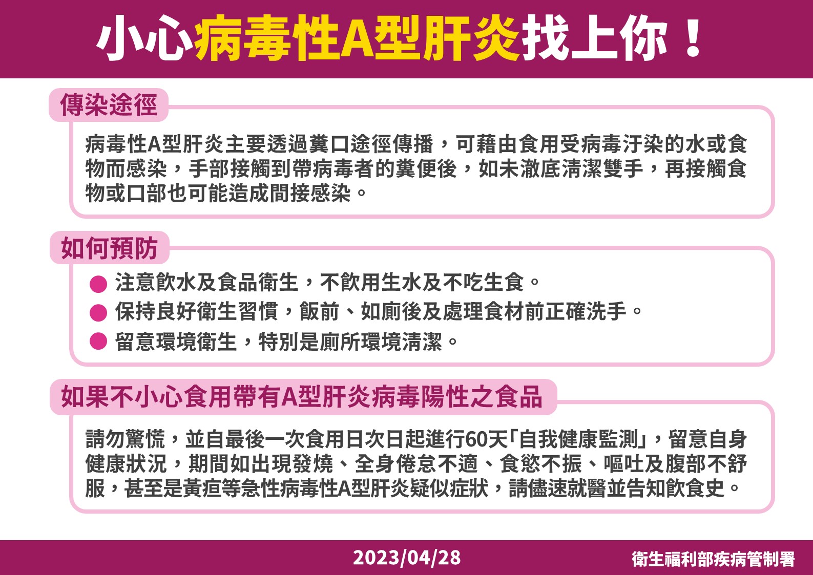 疾管署建議,慢性肝病、肝癌或免疫力低下等具有A型肝炎重症高風險民眾,(如)曾食用該批莓果類產品,可在最後一次食用日後2週內就醫評估自費接種A型肝炎疫苗之必要。疾管署提醒,病毒性A型肝炎主要透過糞口途徑傳播,可藉由食用受病毒汙染的水或食物而感染,手部接觸到帶病毒者的糞便後,如未澈底清潔雙手,再接觸食物或口部也可能造成間接感染,請民眾平日應養成良好的飲食及衛生習慣,以降低感染風險;另因A型肝炎疫苗安全性及效益很高,完成2劑疫苗接種可提供長期保護力,幼兒A型肝炎疫苗已納入我國兒童預防接種公費疫苗項目,請家長按時帶幼兒完成接種。相關資訊請參閱疾管署全球資訊網,或撥打免付費防疫專線1922(0800-001922)洽詢。