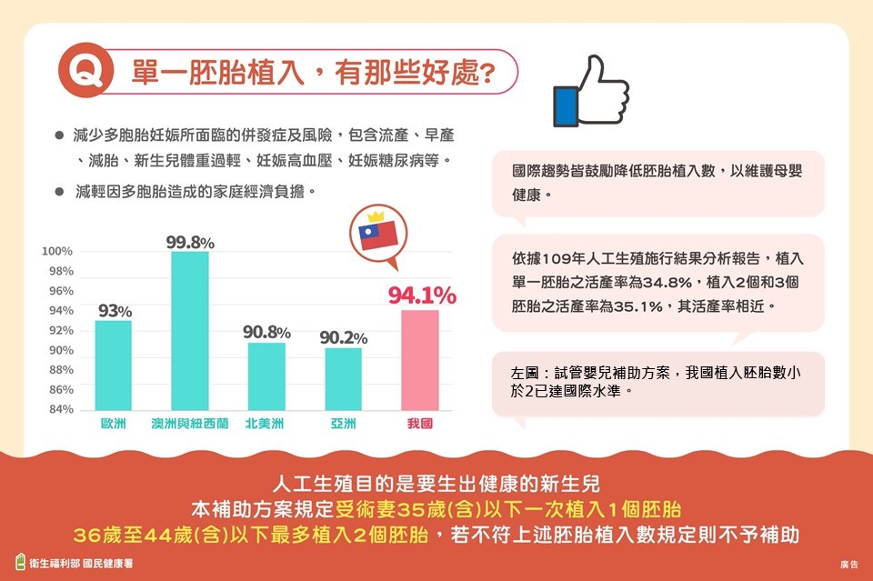上述分析報告也顯示,植入單一胚胎之成功率為34.8%,植入2個或3個胚胎之成功率為35.1%,其兩者成功率相近,但胚胎植入顆數越多,相對也會導致多胞胎妊娠(雙胞胎或以上)的機率增加,進而提高孕產婦發生併發症及胎兒發生早產、低體重兒等的機率,所以國際趨勢皆鼓勵降低胚胎植入數,以維護母嬰健康(如圖2)。