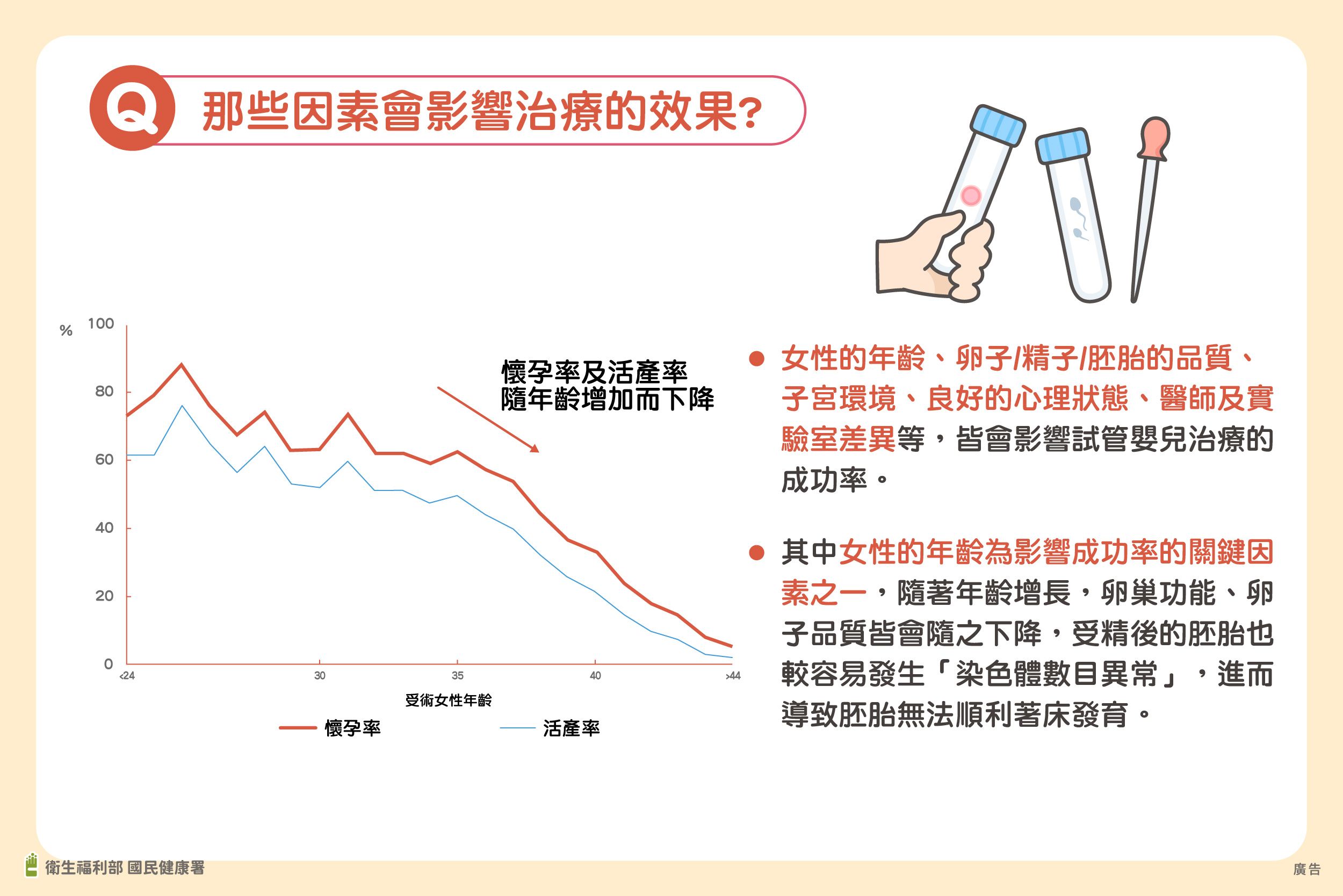 依據109年人工生殖施行結果分析報告資料顯示,我國籍受術夫妻完成植入胚胎療程,有35.0%夫妻成功產下試管嬰兒,影響成功率的因素包含年齡、精子與卵子及胚胎的品質、子宮環境、良好的心理狀態、醫師及實驗室差異等等因素,而且女性年齡是影響成功率的關鍵因素之一,所以還是要及早規劃生育(如圖1)。