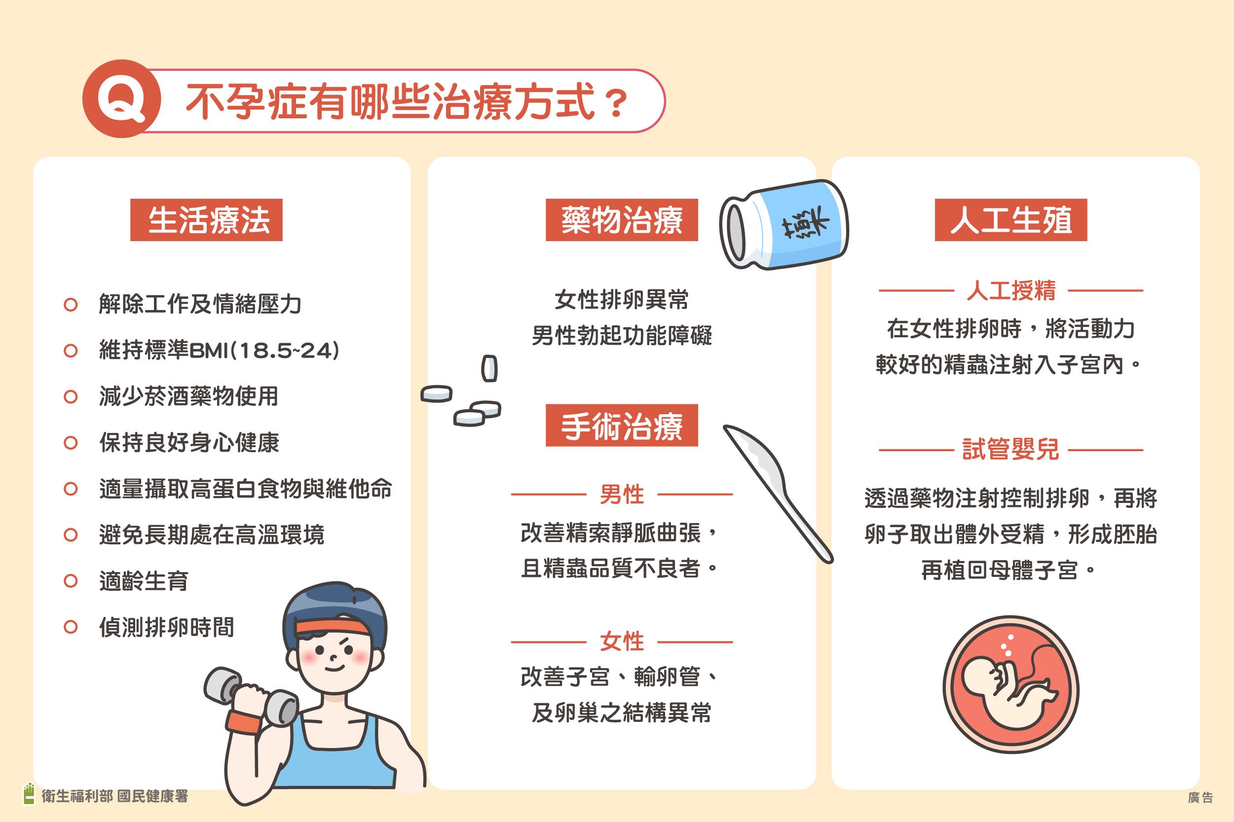 現今社會普遍存在晚婚遲育現象,越來越多民眾遇到不孕或想生卻生不出來的問題,依據國內生殖醫學專家表示,我國約每7對夫妻中就有1對夫妻不孕,為協助不孕夫妻共同面對問題,排除似是而非的觀念,及能充分了解人工生殖相關資訊,提供備孕秘訣,期望讓有意生育夫妻能助孕圓夢,國民健康署解惑3大迷思,破除民眾對人工生殖的疑問: