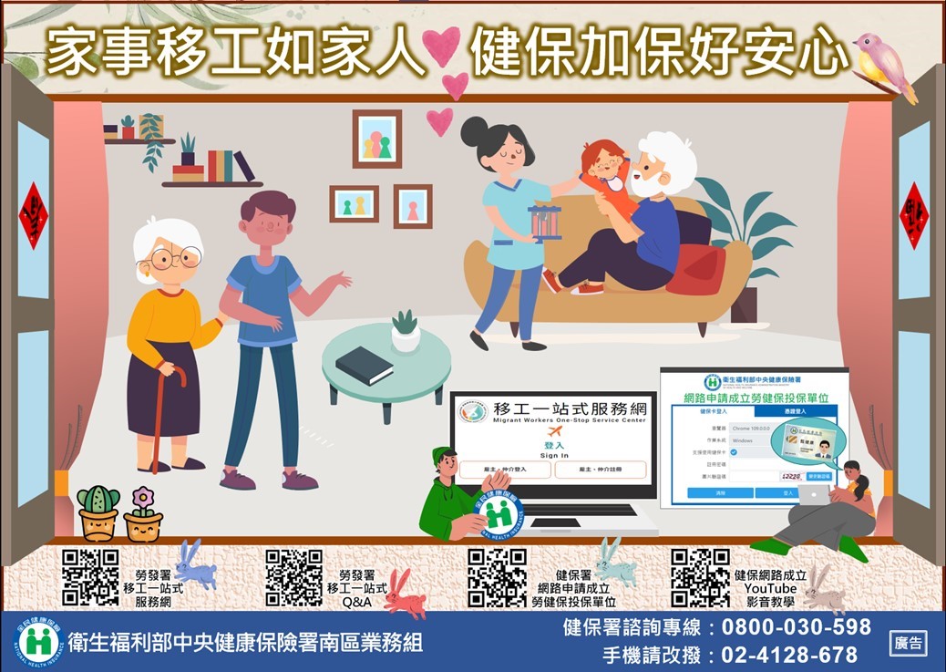 林純美組長表示,至於初聘目前已在臺工作家事移工之雇主,可善用健保署的「網路成立勞健保投保單位」網站,可先至YouTube平臺觀賞健保署錄製的影音教學後,再透過讀卡機並使用已註冊之健保卡或自然人憑證,連結「健保署官網首頁/網路櫃檯/承保網路櫃檯/投保單位/網路成立勞健保投保單位」登入,申報成立健保投保單位及移工加保,方便又快速!如有相關問題,可電洽健保署諮詢專線0800-030-598、手機請改撥02-4128-678詢問。